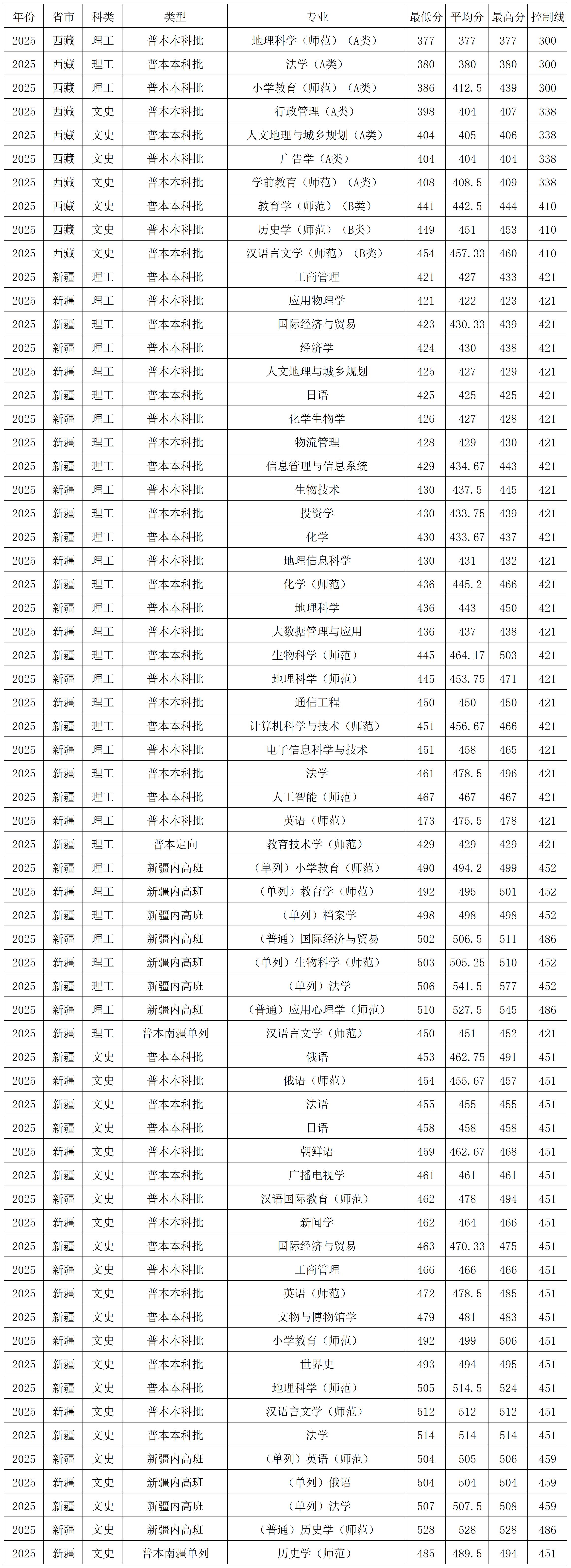 天津师范大学2025年在西藏、新疆各批次各专业录取分数线
