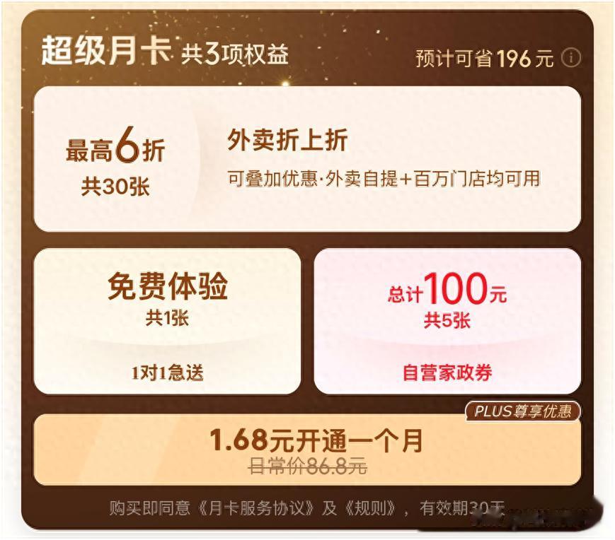 该卡原价86.8元,上新期间仅售6.18元,PLUS会员及外卖新用户更可享1.68元超低价,真正实现“一单回本”。其中,30张外卖折扣券可叠加平台百亿补贴优惠实现折上折、最高享6折,外卖自提均可用,覆盖全国百万门店。