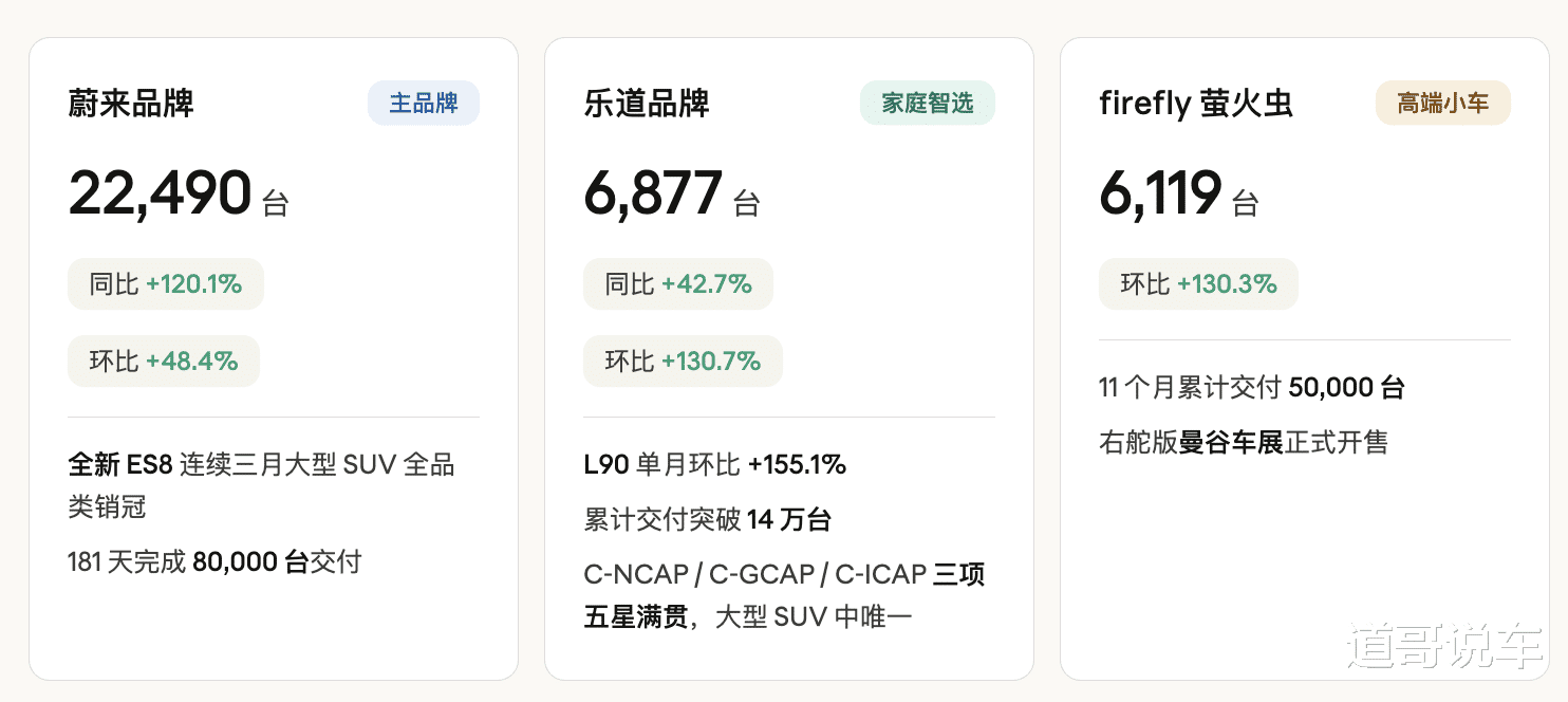 三个品牌同月环比全部翻倍级增长,是蔚来历史上第一次。多品牌矩阵已过磨合期,开始形成协同放大效应。