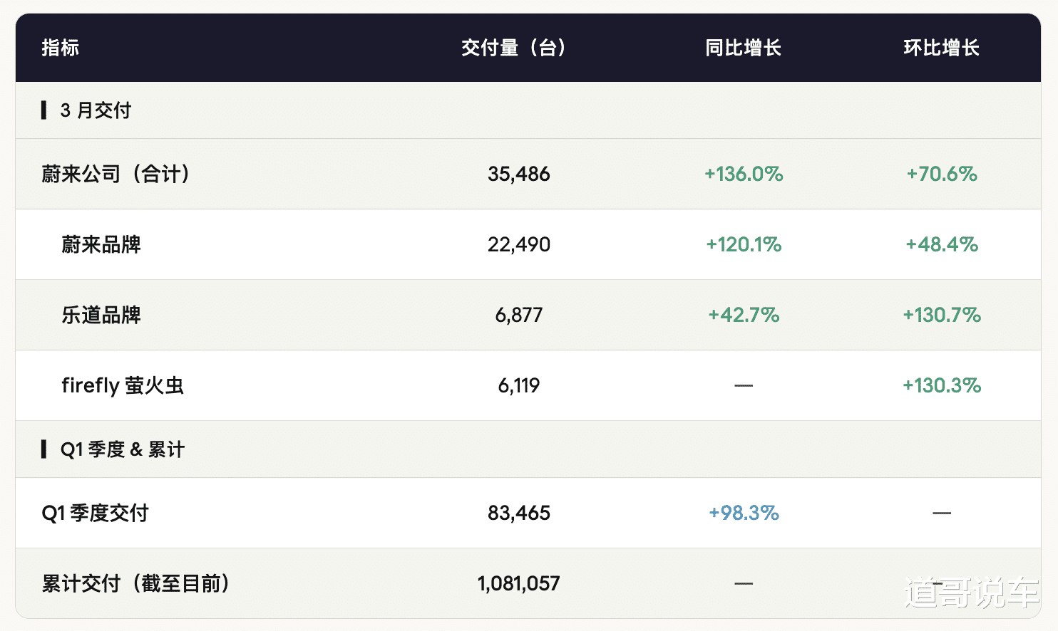 【文/财圈社&道哥说车 张杭】蔚来公司 3 月交付 35,486 台,同比增长 136.0%,环比增长 70.6%;Q1 累计交付 83,465 台,同比增长 98.3%,超财报交付指引上限。累计交付突破 108 万台。