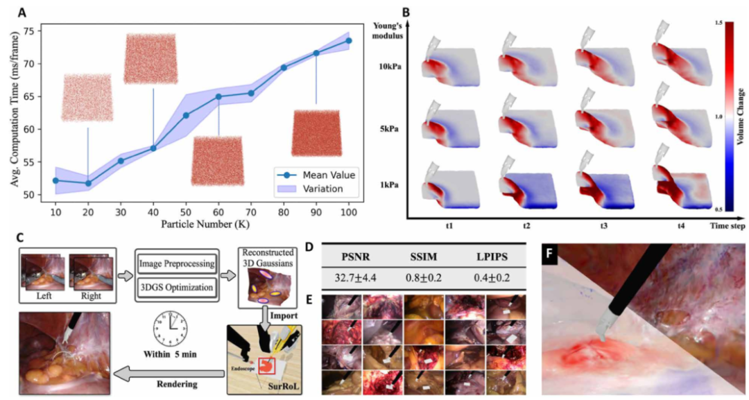 Figure 2:软组织仿真和数据驱动场景重建图。 (A) 随着粒子数量的增加,MPM 软体模拟的计算时间。(B) 具有不同杨氏模量的模拟软组织的变形场。 (C) 通过将 3D 重建结果导入 SurRoL 进行数据驱动的手术场景模拟。(D) 对 PSNR、SSIM 和 LPIPS 指标的重建结果进行定量评估,报告为平均值±SD。 (E) 可以从数据生成的各种场景的可视化。 (F) 生成的场景支持工具与组织的相互作用,并通过 SurRoL 中的 MPM 计算变形。