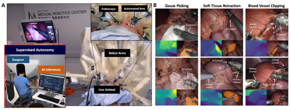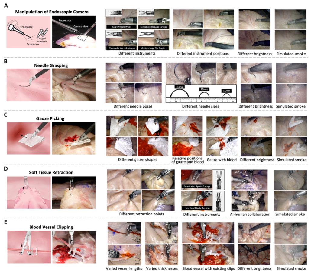 Figure 7:在自主监督下通过活体动物试验进行体内验证。 (A) 香港多尺度医疗机器人中心混合手术室的体内实验装置。 (B) 自动化手术任务的图示,包括纱布拾取、软组织牵开和血管夹闭。每个任务显示两个示例场景,其中包含内窥镜图像(上)、估计深度图(左下)和目标对象分割(右下)。