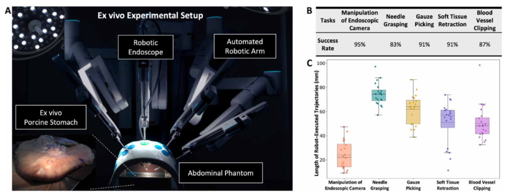 Figure 5:使用 Sentire 手术系统对五种手术辅助任务进行离体验证。 (A) 使用离体猪组织的实验装置的图示。(B) 五次进行的手术辅助任务的成功率。 (C) 从运动学数据记录的每个任务的机器人执行轨迹长度的结果。
