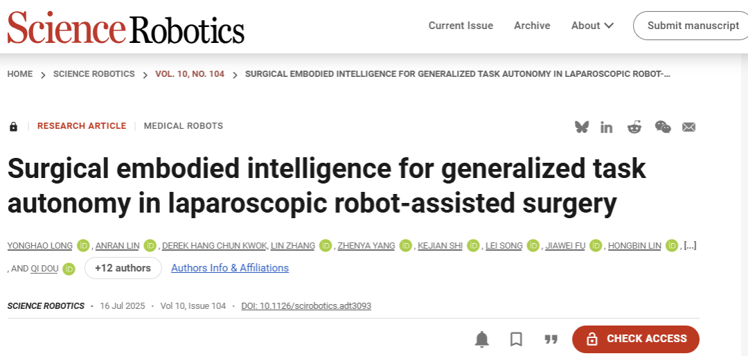 引文格式:Long Y, Lin A, Kwok D H C, et al. Surgical embodied intelligence for generalized task autonomy in laparoscopic robot-assisted surgery[J]. Science Robotics, 2025, 10: eadt3093.