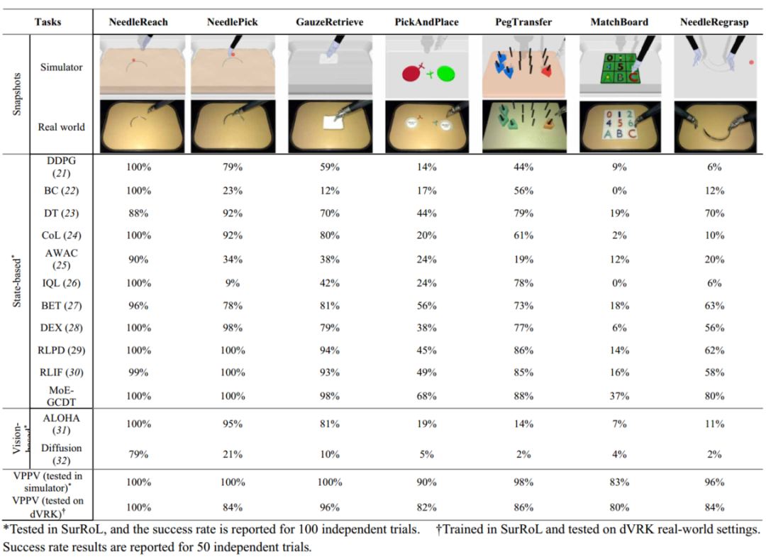 图3的表格对比了十几种RL/IL方法。他们的VPPV方法在模拟器中的成功率高得离谱:NeedleReach、NeedlePick、GauzeRetrieve三个简单任务都是100%,PickAndPlace 90%,PegTransfer 98%,MatchBoard 83%,NeedleRegrasp 96%。更关键的是,把这些策略直接部署到达芬奇研究套件上,成功率只下降了8%左右——这就是零样本迁移的效果。作为对比,ALOHA和Diffusion Policy在模拟器里能学,一到真实世界就失效。