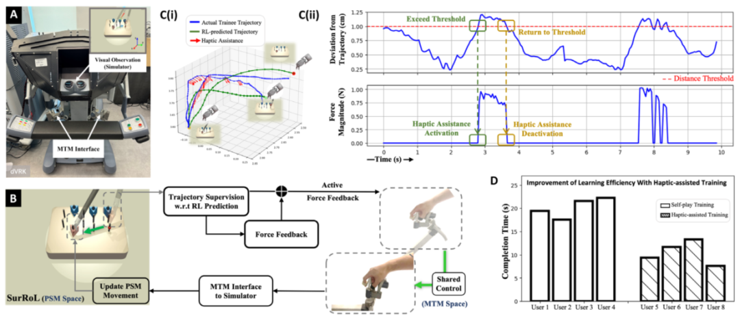 Figure 4:SurRoL 人机界面的图示和结果及其在触觉辅助技能教育中的应用。 (A) 模拟器连接到 dVRK 的 MTM。 (B) 我们提出的触觉辅助手术技能训练方法,该方法使用强化学习预测轨迹通过人机共享控制提供智能指导。 (C) (i) 仪器运动轨迹的可视化(钉转移任务),其中在检测到相对较大的偏差时激活触觉辅助。 (ii) 轨迹偏差和力大小随时间的可视化。 (D) 通过测量训练后任务完成时间来提高学习效率的用户研究。
