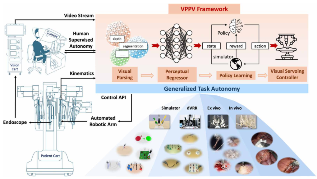 Figure 1:概念总览图。通过具体智能训练的基于视觉的学习范式可以实现手术机器人的通用任务自动化。