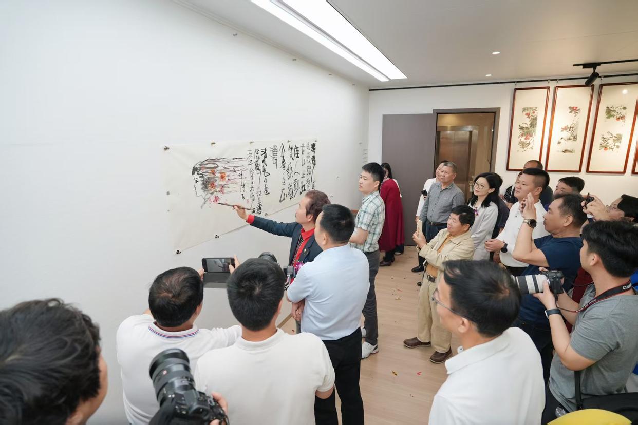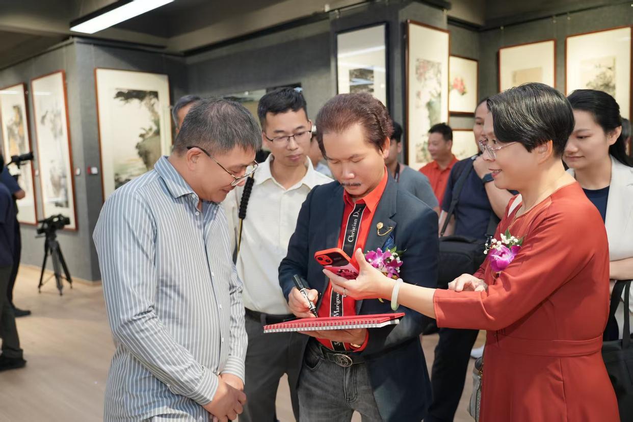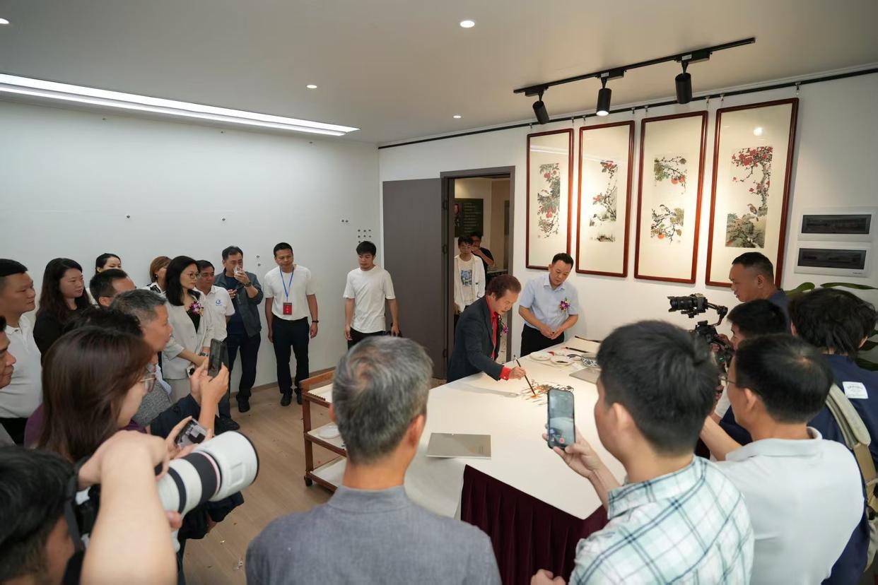 开幕式结束后,嘉宾们有序进入位于新江大厦12楼的岑昱艺术馆参观展览。本次展出的作品涵盖山水、花鸟等多元题材,兼具岭南地域特色与个人艺术风格。《锦羽呈祥》中孔雀的绚丽色彩与红叶相映成趣,《山高水长》以雄浑笔墨勾勒自然山水风貌,《红荔飘香》将岭南经典元素与鸟类意象巧妙融合,《香远益清》《君子清风》等作品则尽显自然景致的雅致之美。陈醉、许鸿飞、岑昱三位艺术家还现场挥毫泼墨,赠送墨宝,让现场观众近距离感受国画艺术的独特魅力。