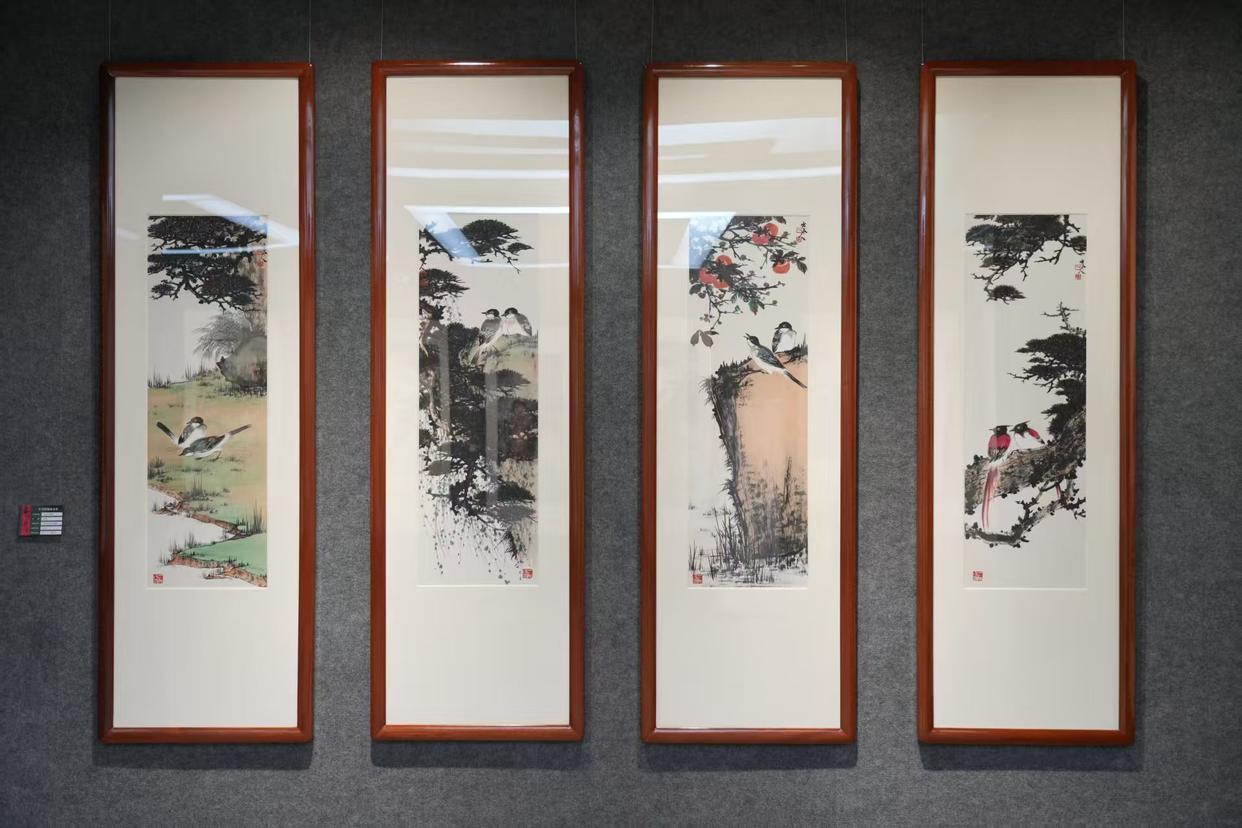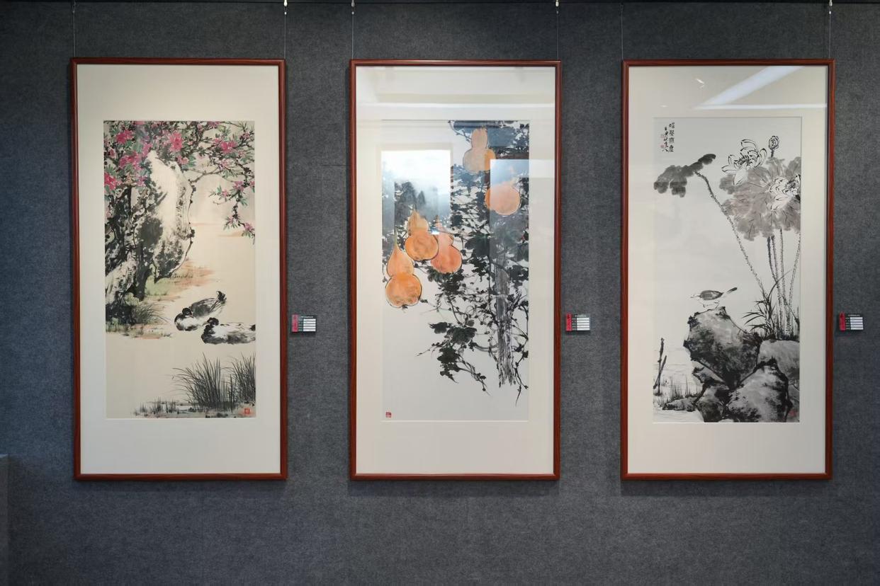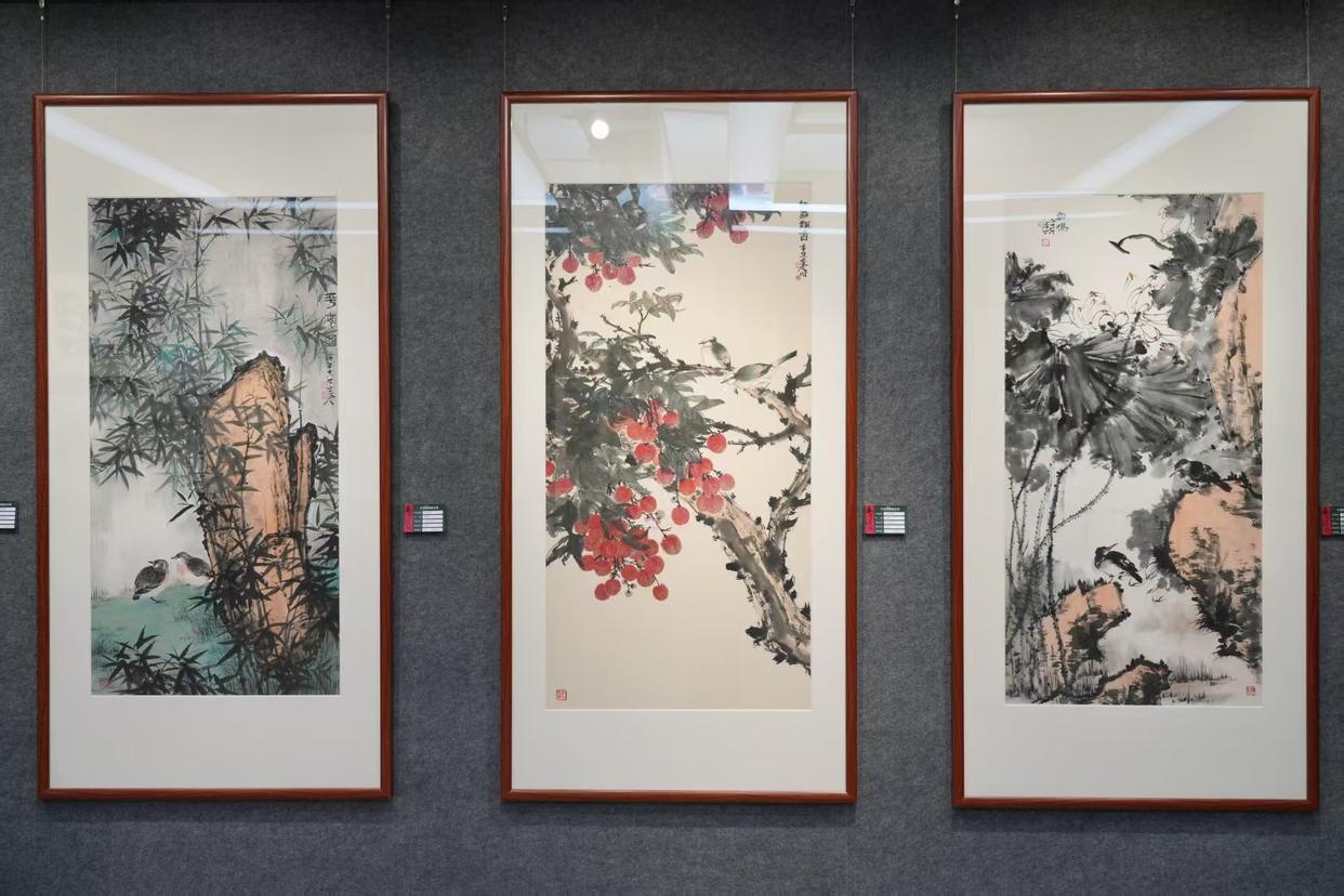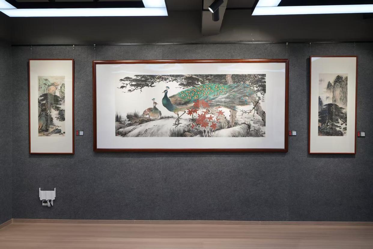 开幕式结束后,嘉宾们有序进入位于新江大厦12楼的岑昱艺术馆参观展览。本次展出的作品涵盖山水、花鸟等多元题材,兼具岭南地域特色与个人艺术风格。《锦羽呈祥》中孔雀的绚丽色彩与红叶相映成趣,《山高水长》以雄浑笔墨勾勒自然山水风貌,《红荔飘香》将岭南经典元素与鸟类意象巧妙融合,《香远益清》《君子清风》等作品则尽显自然景致的雅致之美。陈醉、许鸿飞、岑昱三位艺术家还现场挥毫泼墨,赠送墨宝,让现场观众近距离感受国画艺术的独特魅力。