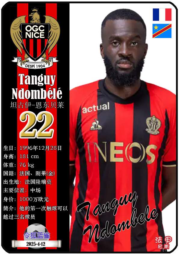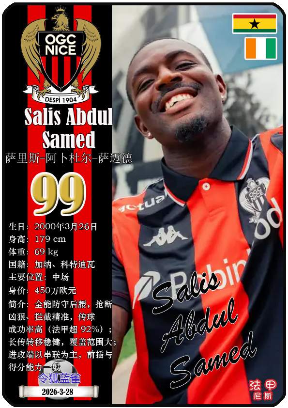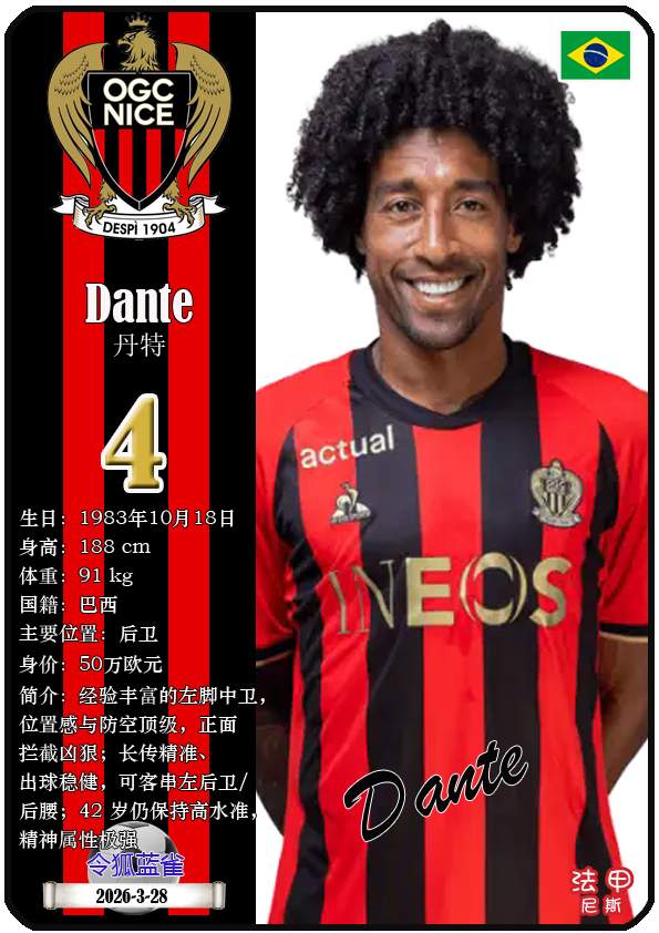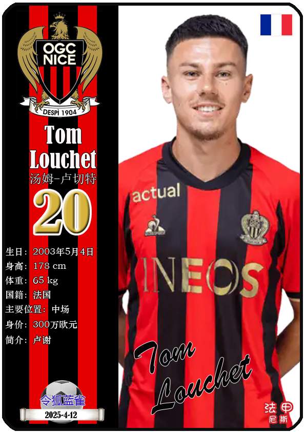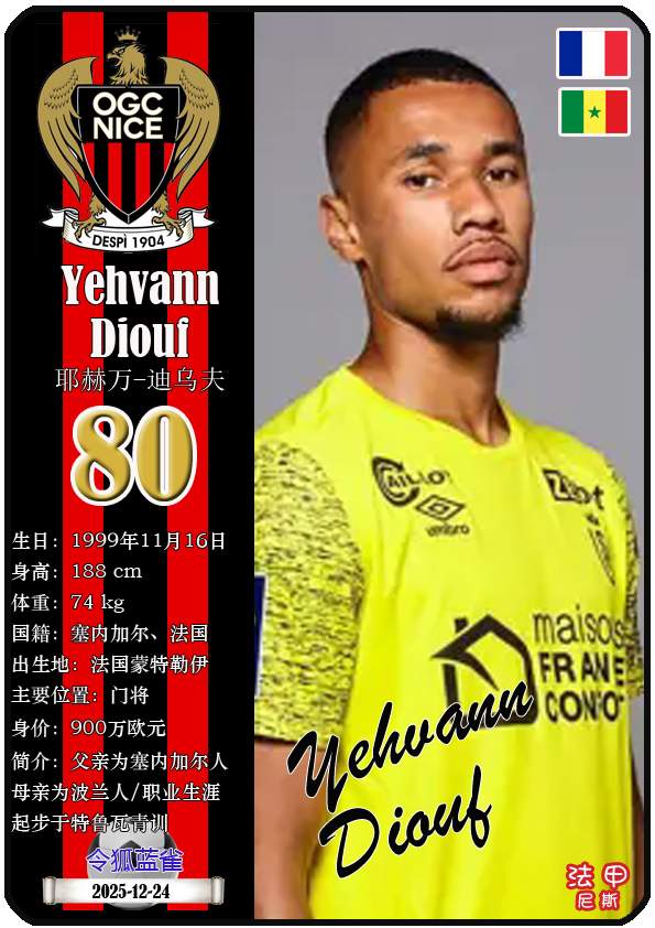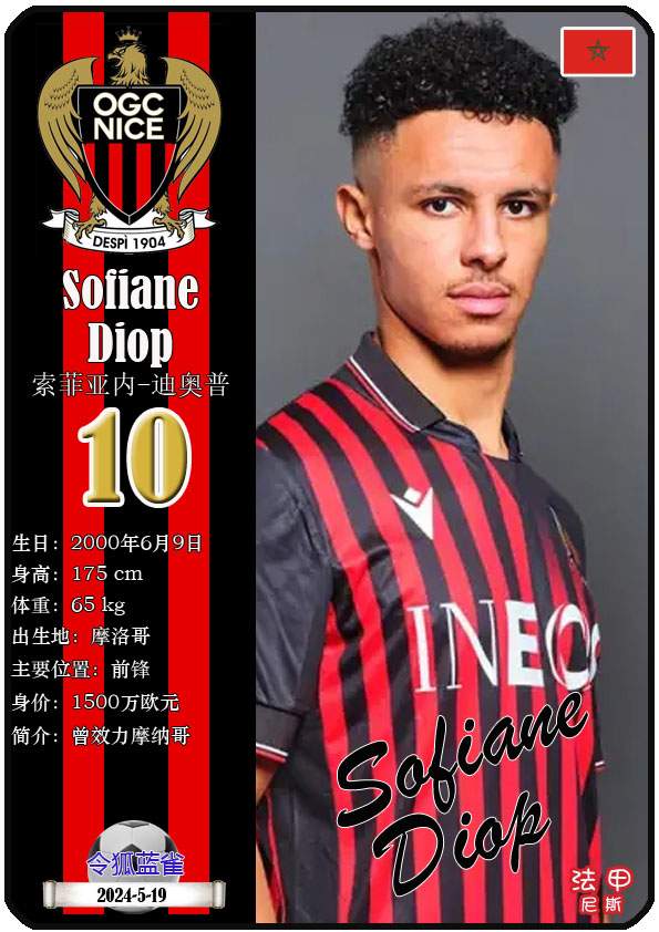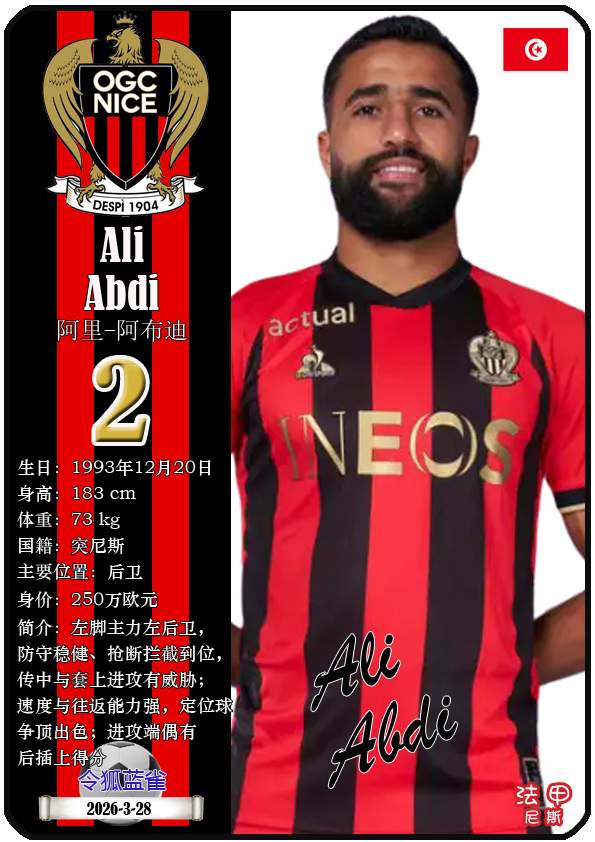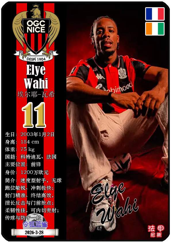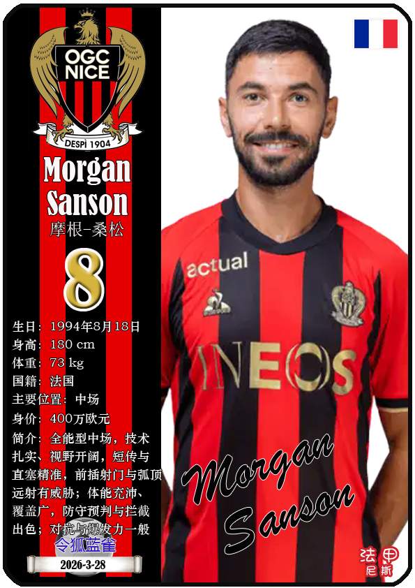 截至2026年3月28日,法国足球甲级联尼斯足球俱乐部主教练是克劳德-普埃尔,队内拥有球员索菲亚内-迪奥普、摩根-桑松、埃尔耶-瓦希等。本期以球星卡的形式展示目前法甲尼斯足球俱乐部的21名球员(按球衣号码排序):