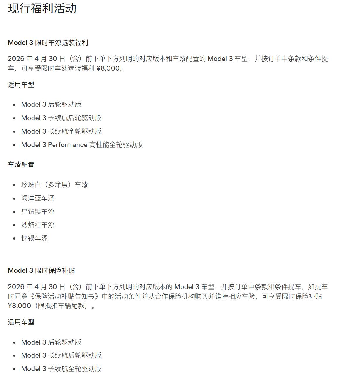 除了保险优惠补贴外,还有一个8000元的限时车漆补贴,这个补贴对于Model 3 和Model Y 都适用;并且不再需要寻找引荐人等条件限制,即可参与优惠活动;活动时间同样是在2026年4月30日(含)前可享受;