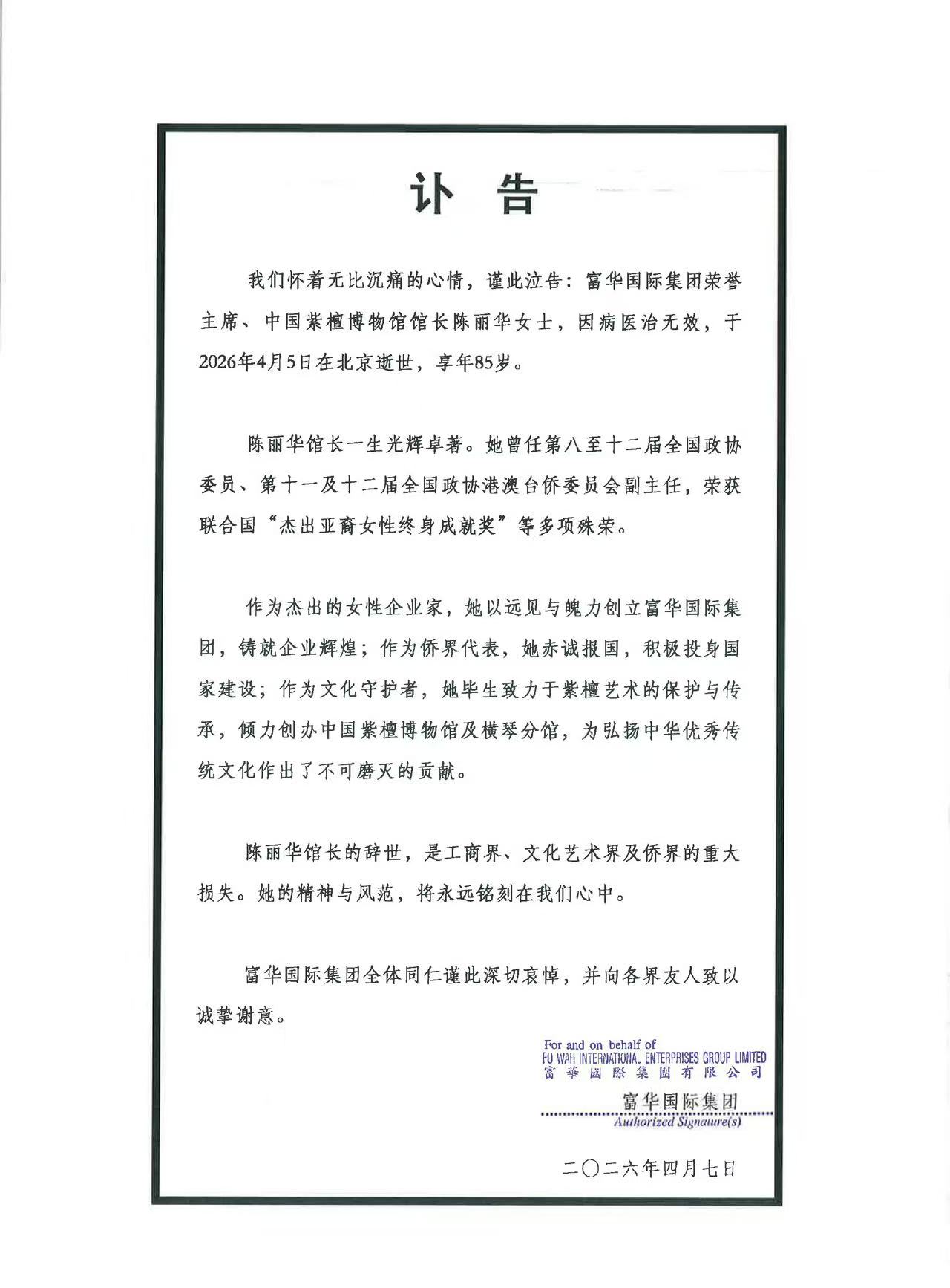 4月7日,突传富华国际集团陈丽华逝世,享年85岁。她是中国紫檀博物馆馆长,也是叶赫那拉氏第八代后裔,正黄旗世家出身。