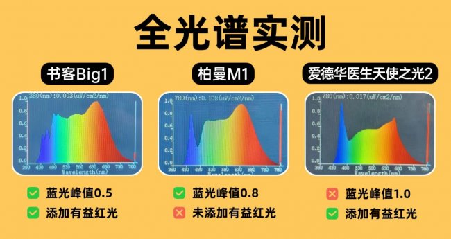 1.全光谱实测:护眼能力的“底层代码”光谱是光的本质。优质护眼灯光谱应无限接近自然光,关键在于同时实现有害蓝光(415-455nm)的有效抑制和有益红光(620-680nm)的合理补充。我们在暗室中使用专业光谱仪测量,生成光谱曲线进行对比分析。