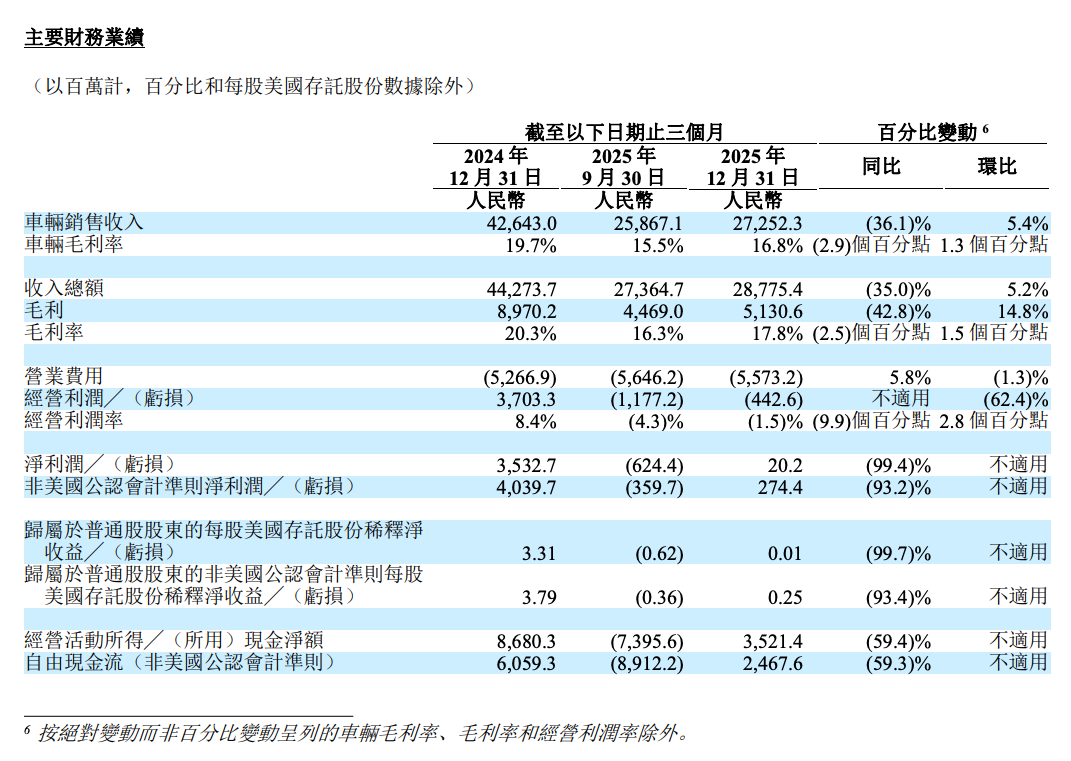 随着理想i6热销,理想汽车的利润空间已显著收窄。财报显示,2025年Q4,理想汽车车辆毛利率为16.8%,同比下跌2.9个百分点;整体毛利率为17.8%,同比下跌2.5个百分点。