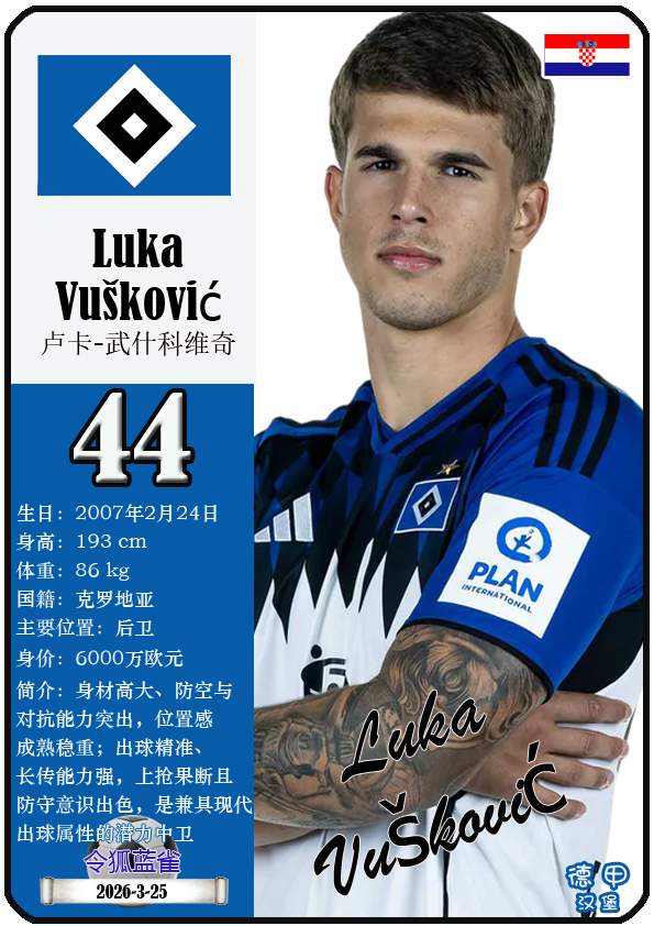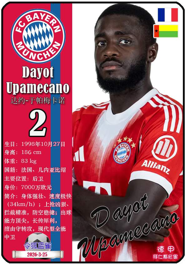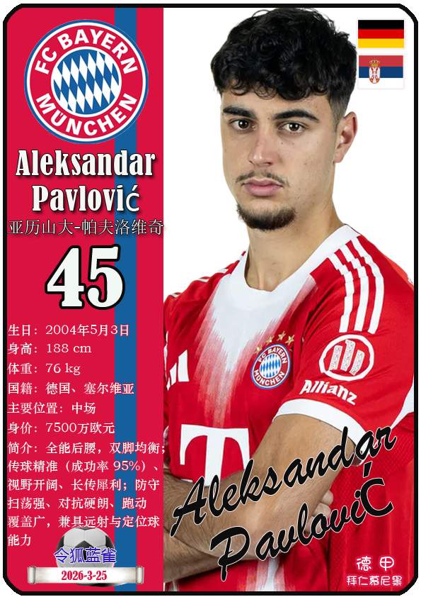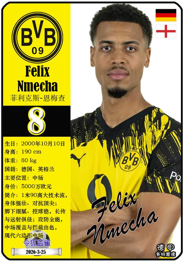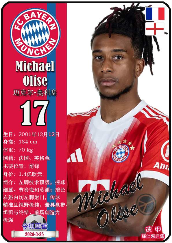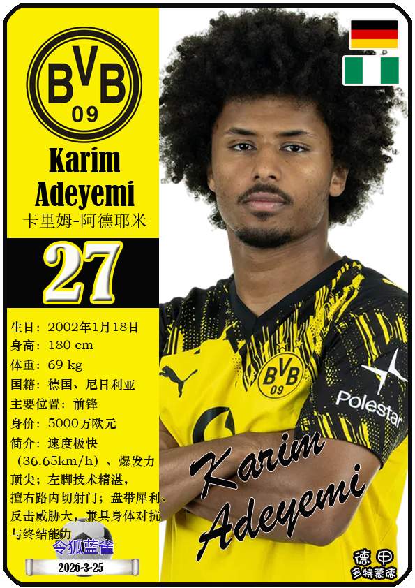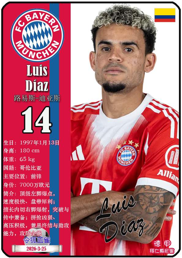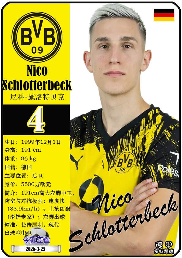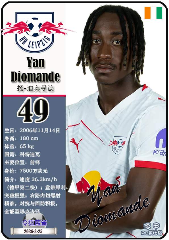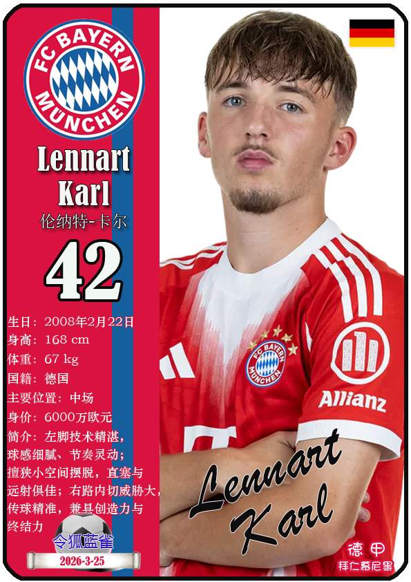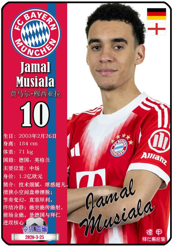 截至2026年3月25日,德国足球甲级联赛身价为5000万欧及以上的球员共12人,本期盘点该12位球员(按所属俱乐部分类排序):