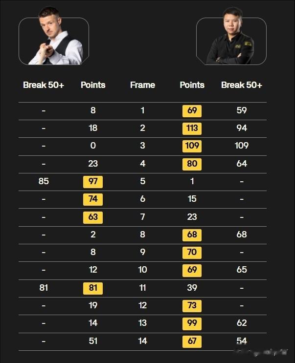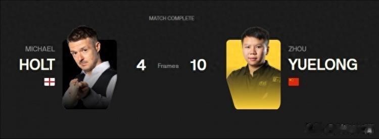 本场比赛周跃龙贡献一杆 109 分破百,外加七杆 50+;迈克尔・霍尔特则打出单杆 85 分和 81 分。首阶段战罢,周跃龙以 6-3 领先霍尔特;进入第二阶段,他一路掌控局势并率先拿到赛点,最终以 10-4 取胜晋级。
