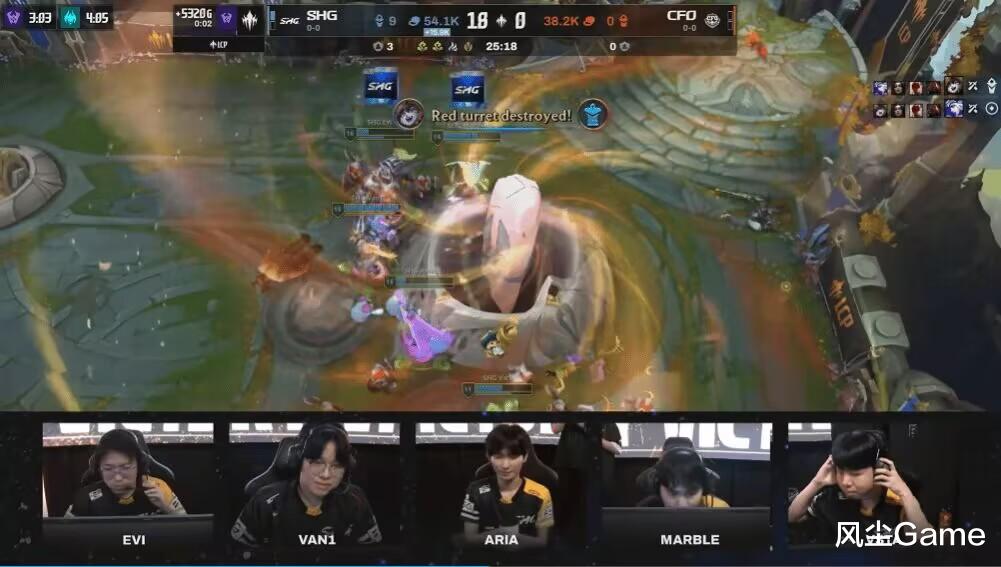 第一把CFO全线被爆,比赛26分钟结束,两队人头比16:1,CFO只有Doggo,在下路击杀过一次辅助,第二把更抽象,25分钟基地爆炸的时候,CFO全队都是0人头,HongQ和JunJia一走,CFO直接成了路边了,更抽象的是,SHG上单选手Evi,已经是31岁的老将了,对线照样能抽陀螺。