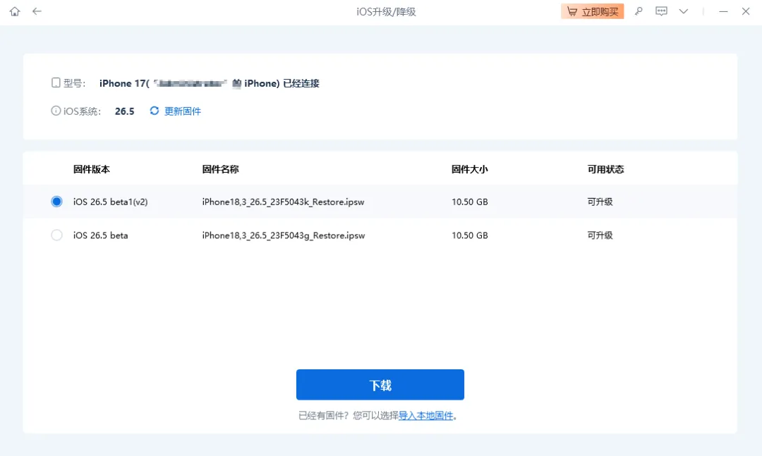 步骤3:选择需要升级的固件版本后,点击【下载】等待开始下载iOS固件