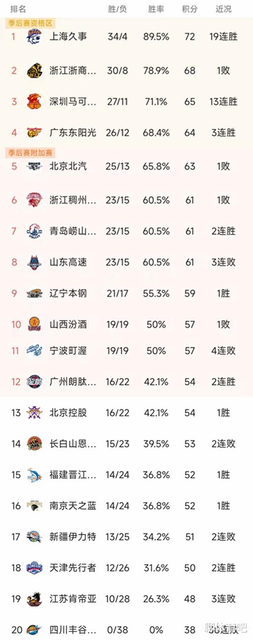 山西和北控迎来关键的卡位战,迪亚洛只出手了5次只有9分,奈特空砍了23分10助攻,山西89-102失利,目前的战绩是19胜19负,和宁波持平,仅仅排在第10名,好在还领先广州、北控3个胜场,最快下一轮就能锁定季后赛门票。北控保留了冲击第12名的机会,目前落后广州暂列第13名。广州今晚80-67轻取江苏迎来两连胜。吉林冲击前12名稍微掉队,81-98不敌南京暂列第14名。新疆98-100憾负天津,只领先天津1个胜场暂列第17名。