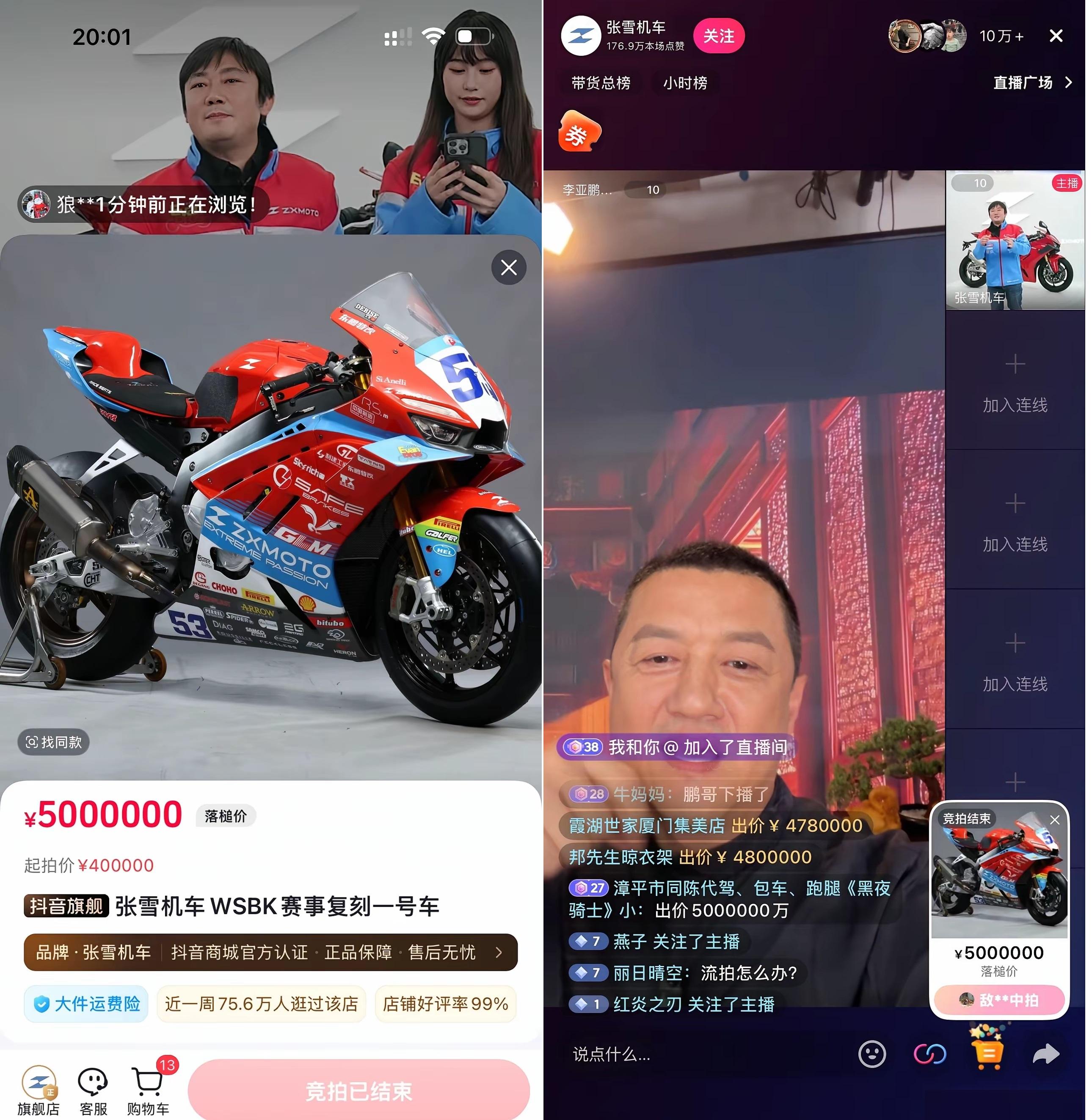 2026年4月10日,晚8点整。张雪机车官方直播间,WSBK夺冠赛车53号复刻版正式开拍。起拍价40万元,每次加价幅度2万元,封顶500万元。