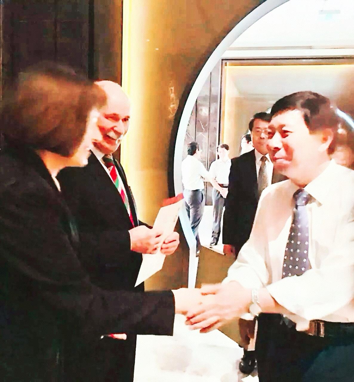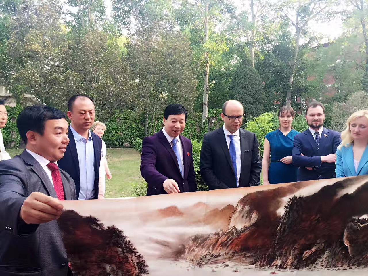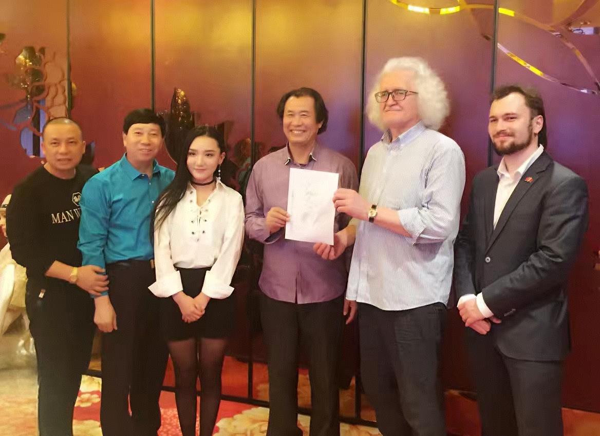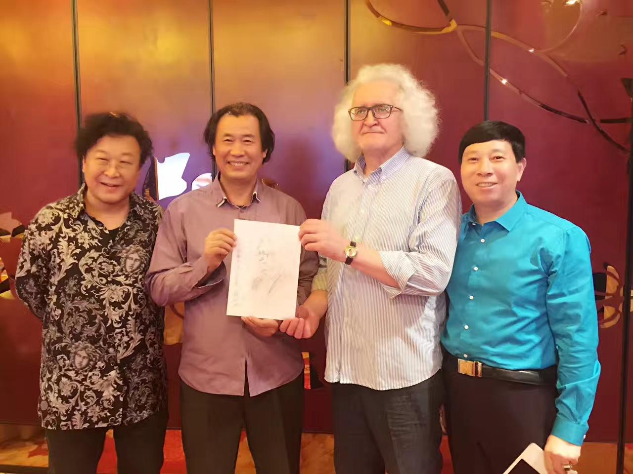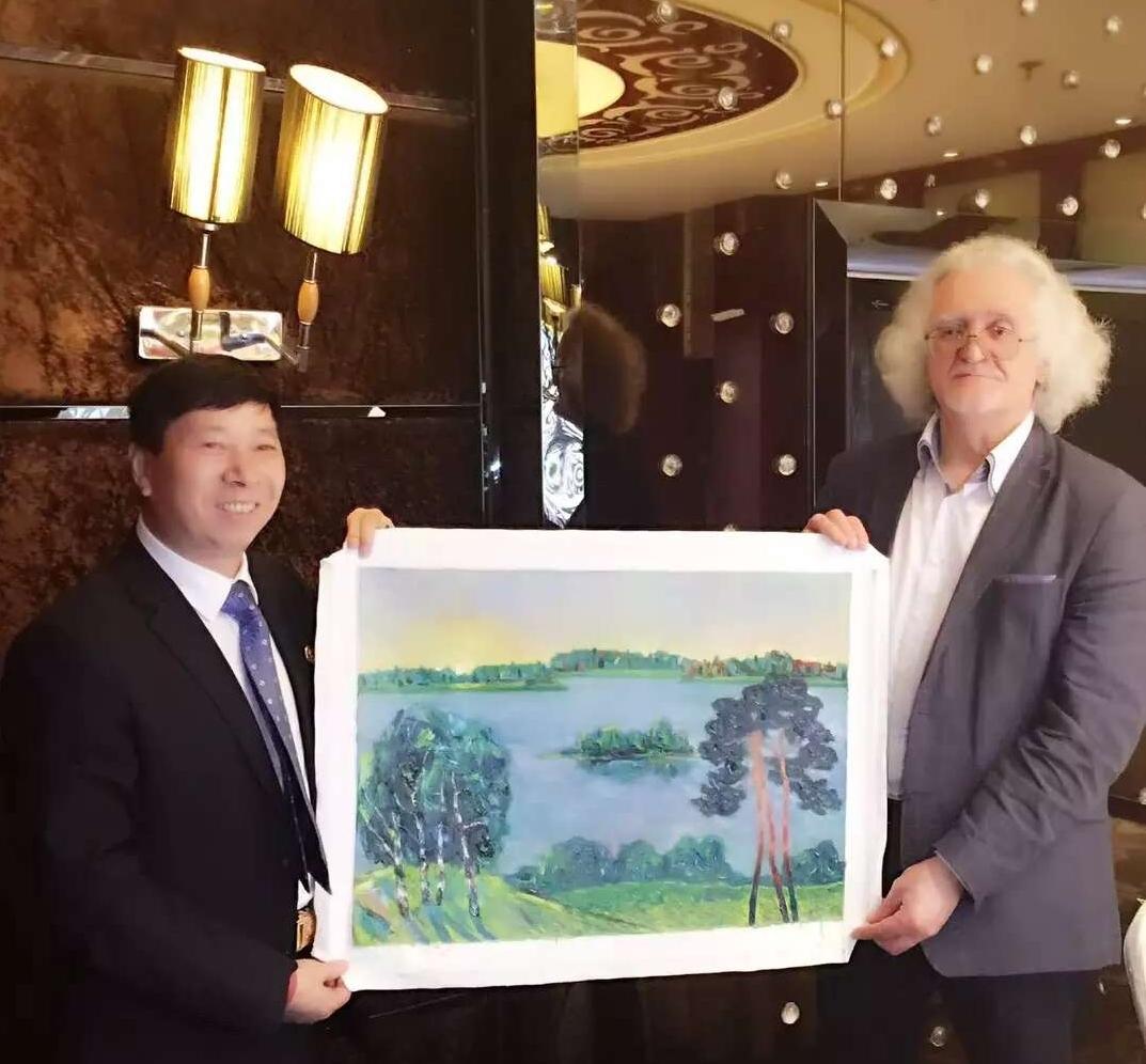 4月10日,刘瀚锴、孙潇在北京特邀首都各界人士,欢迎联合国教科文组织的代表、白俄罗斯国家文联主席普罗克普佐夫、副主席伊戈尔•巴巴克一行!普佐夫主席现场向刘瀚锴馈赠个人油画作品。
