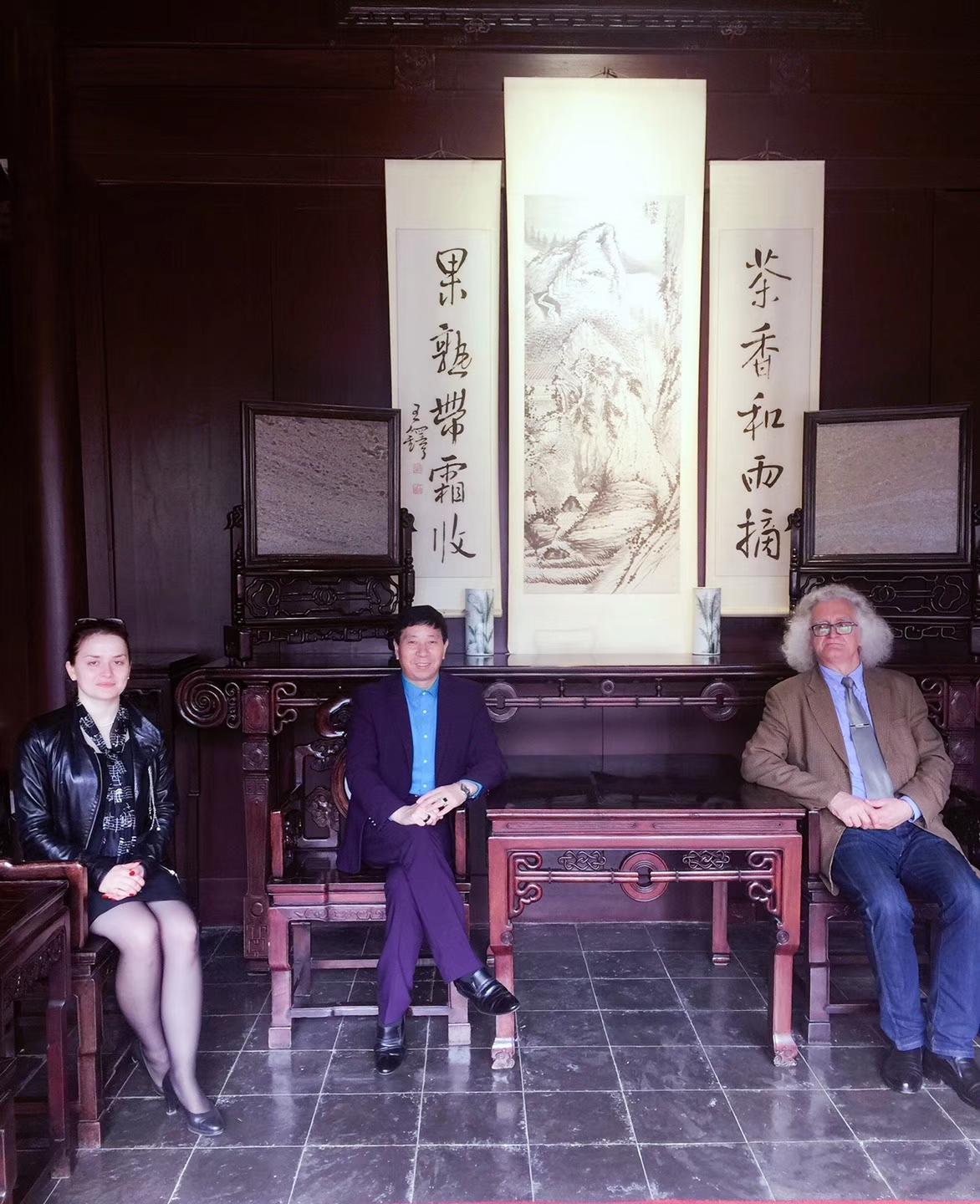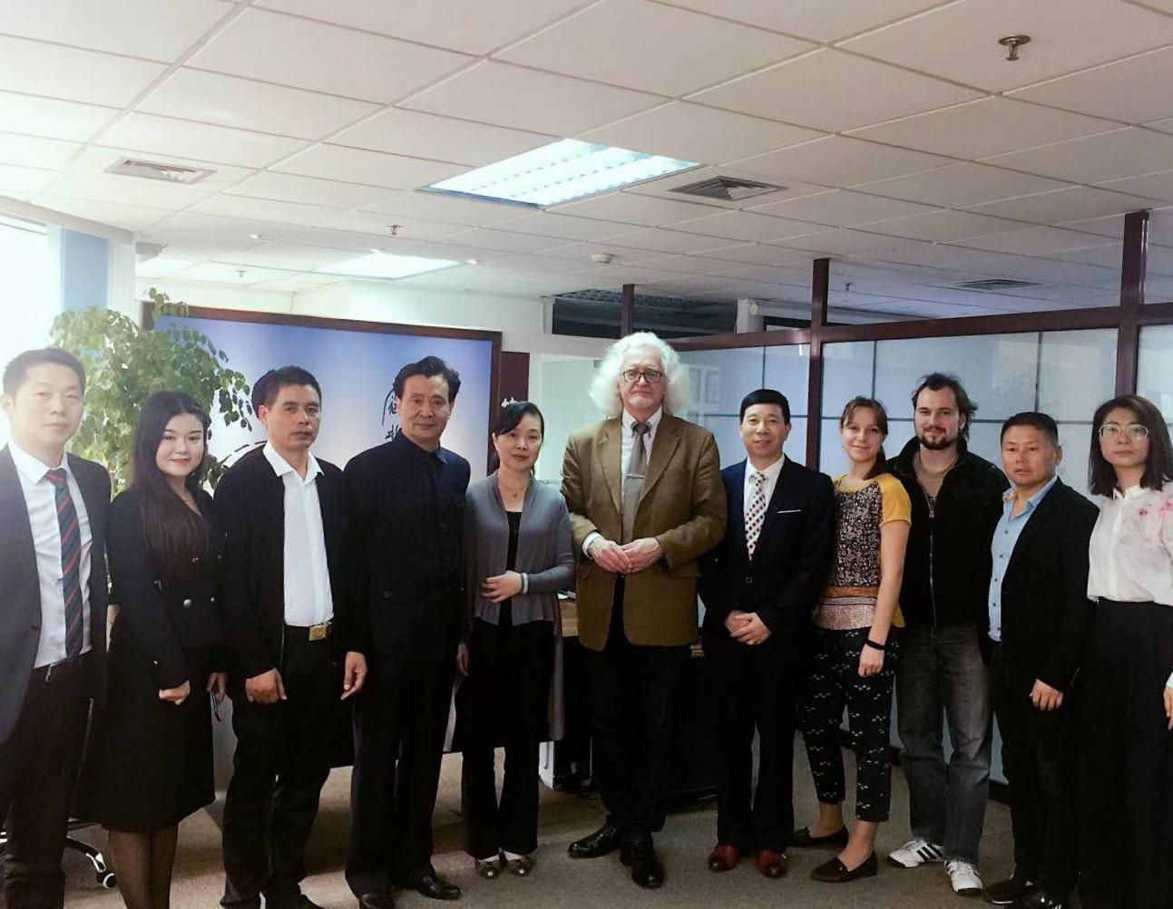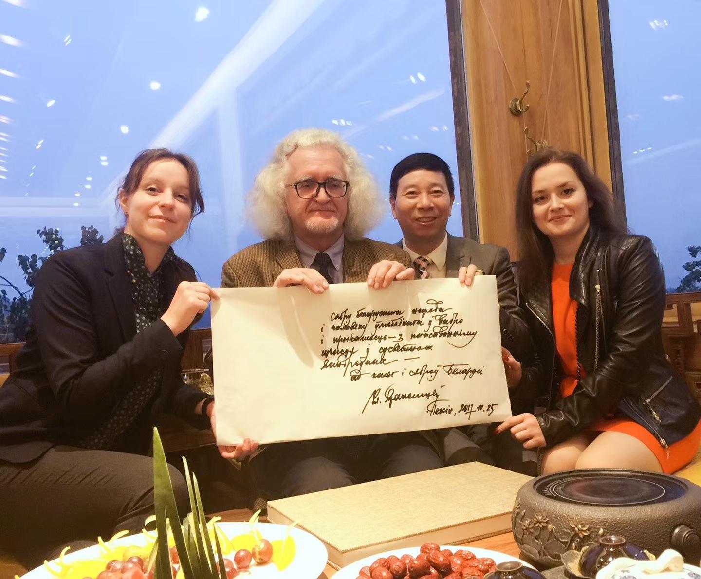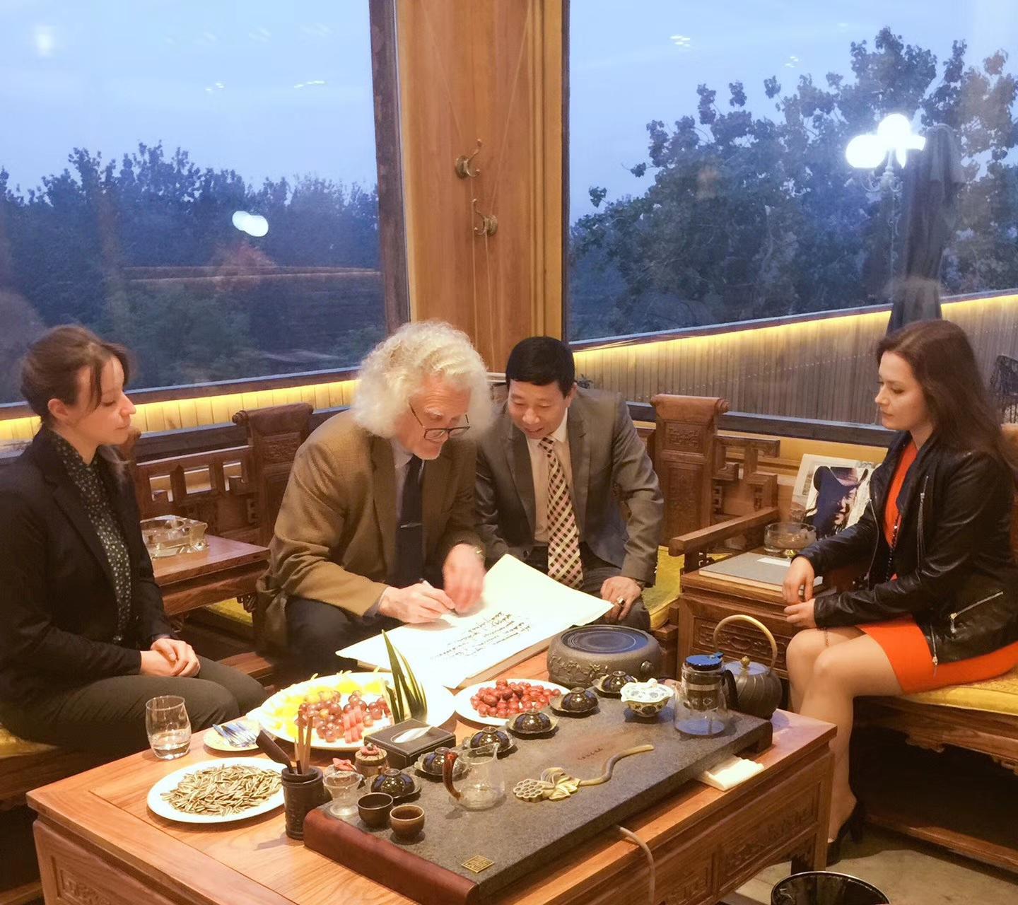 10月25日,联合国教科文组织的代表、白俄罗斯国家文联主席普佐夫,文联中国首席代表刘瀚锴,文联秘书玛莎,中国驻外大使馆原处长汪建国夫妇及记者紫萱,作客北京地安门并与负责人张拥军、《人民日报》海外版陈厚学、著名油画家徐建新教授亲切交流!同时,普佐夫主席欣然为刘瀚锴所著《人在旅途》题词!