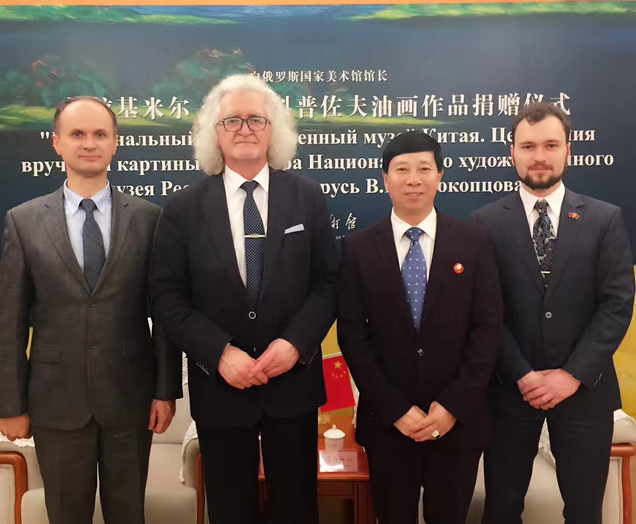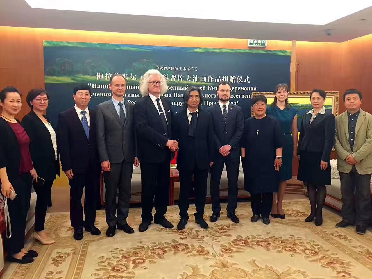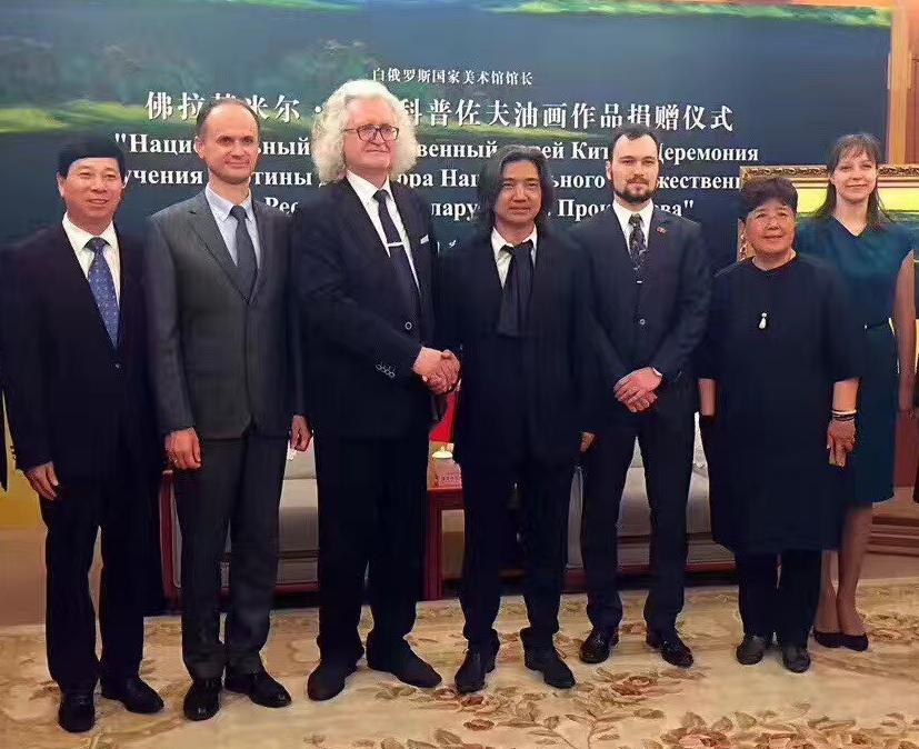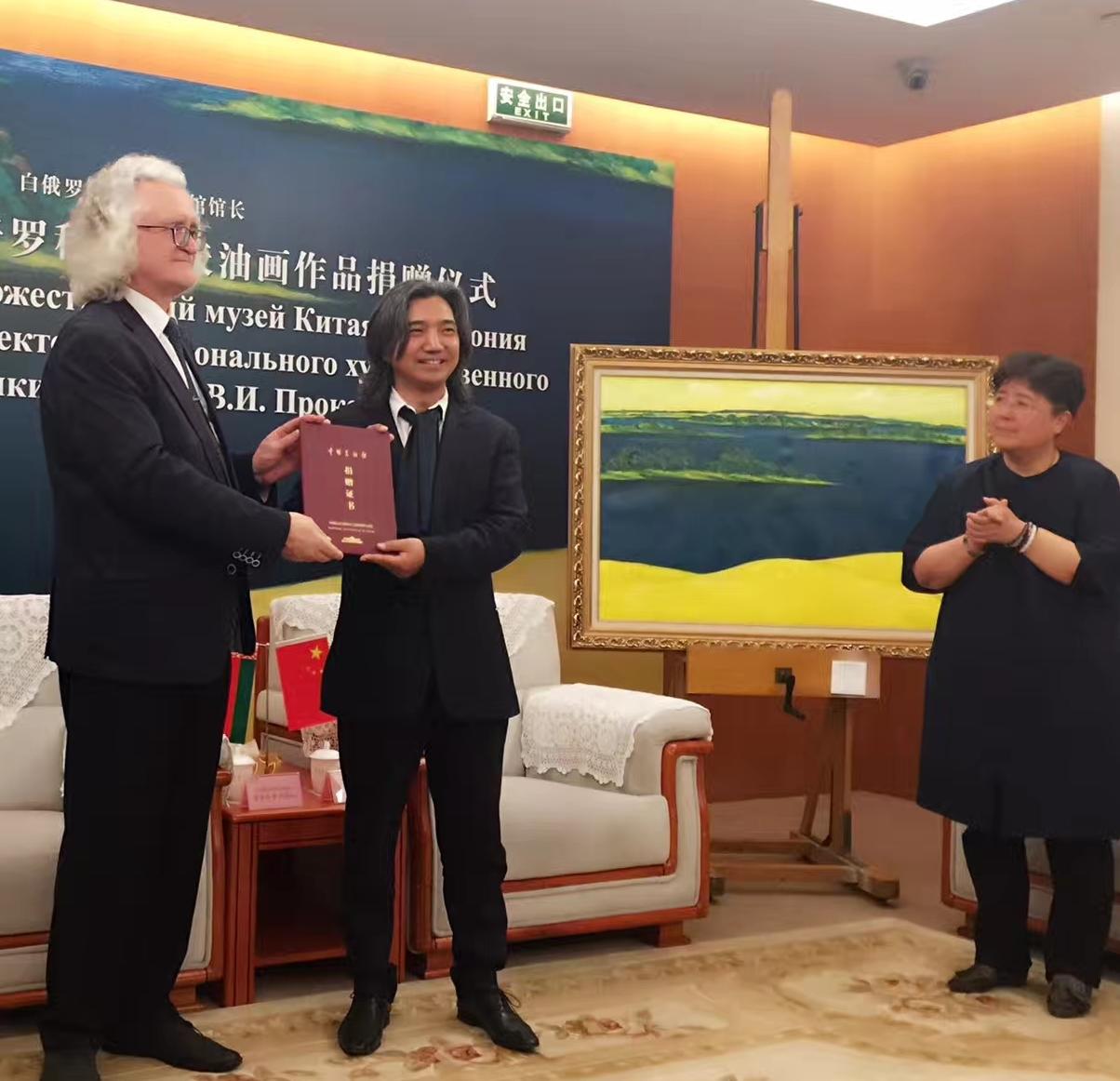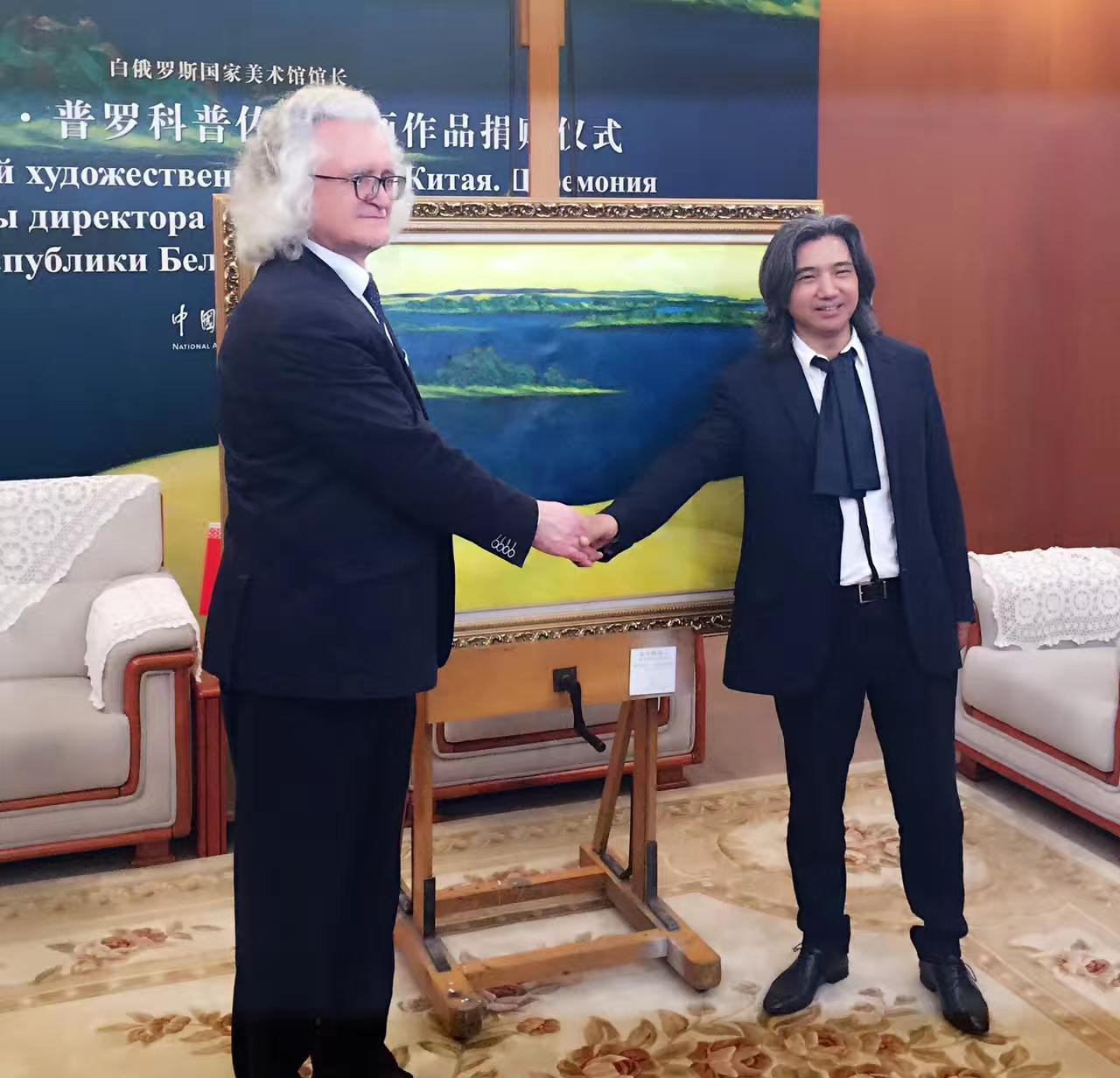 4月26日,白俄罗斯国家文联主席、国家美术馆馆长普罗克普佐夫,向中国美术馆捐赠《父母的故土》油画作品。中国美术馆馆长吴为山接受作品捐赠!白俄罗斯驻华大使馆参赞谢尔盖,白俄罗斯国家文联副主席国沙、文联中国首席代表刘瀚锴、文联秘书玛莎出席活动!