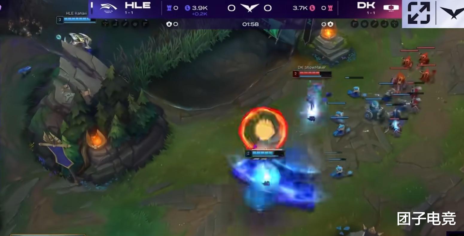 这里我们先说第一局,DK这个bp明显是想要打poke后的防守反击,而HLE则是明确要前期节奏以及中后期的四一分推。