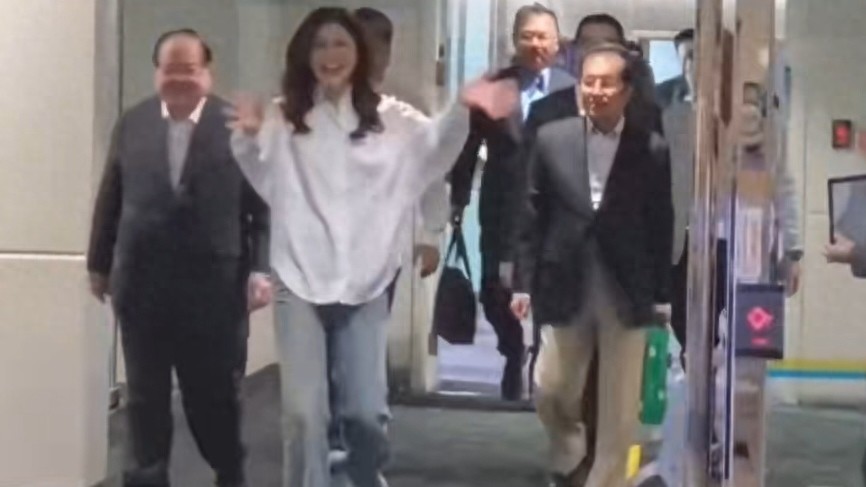 从郑丽文的表情来看,她面带微笑,向接机代表挥手致意,兴奋之情溢于言表。