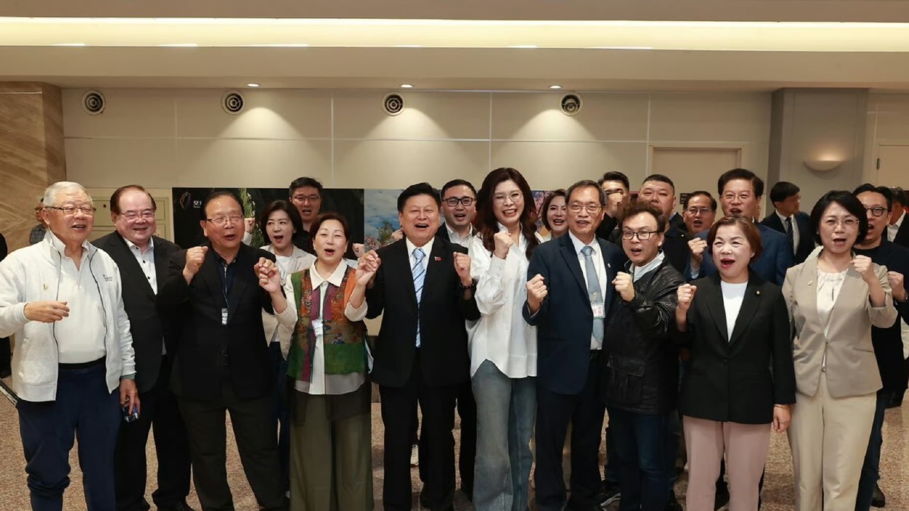 从照片可以看到,郑丽文站中间,她的左侧(观众视角)就是傅崐萁。
