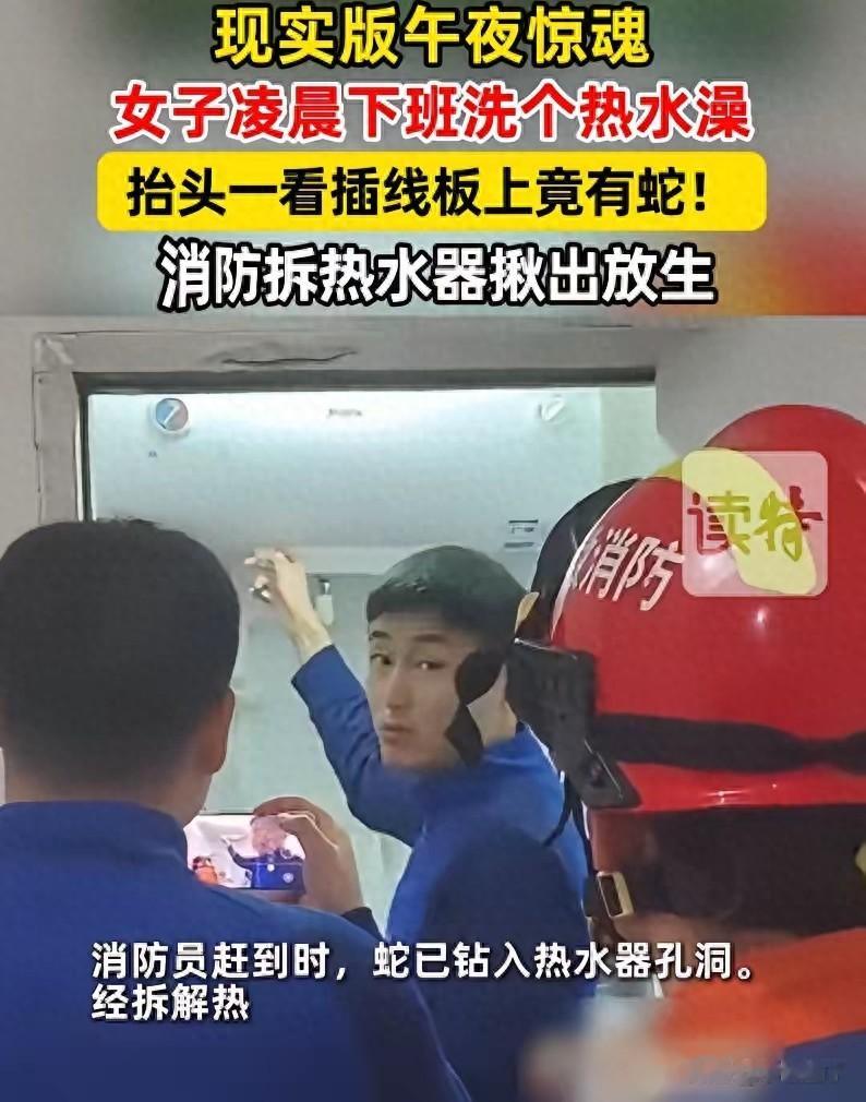 * 抓捕过程: 胡女士吓坏后立刻求助消防。但这蛇非常狡猾,听到动静后钻进了热水器背后的孔洞里。消防员为了抓蛇,不得不拆解了部分热水器,最终才将蛇揪出并带走放生。