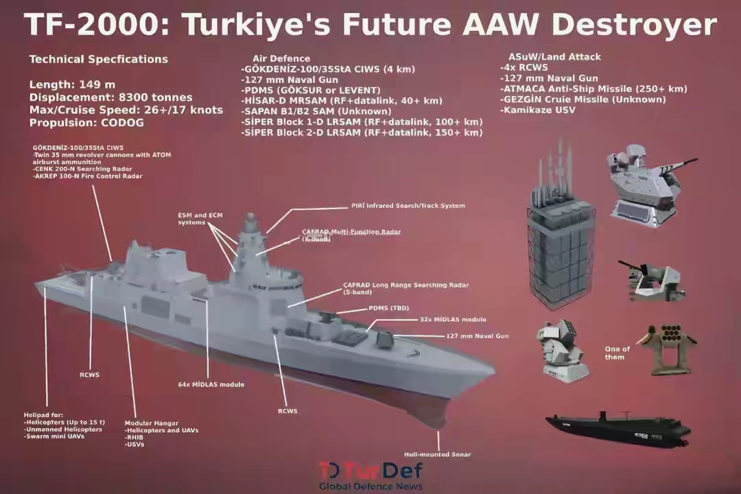 从公开的数据来看,TF-2000型驱逐舰舰长约为149米,舰宽21.3米,满载排水量达到8500吨。两台美制LM-2500燃气轮机以及两台土耳其国产柴油机组成柴燃联合动力,但最高航速仅有约26节,整体航速并不理想,与全球主力驱逐舰还有一定的差距,而在经济航速下拥有6000海里的续航里程。