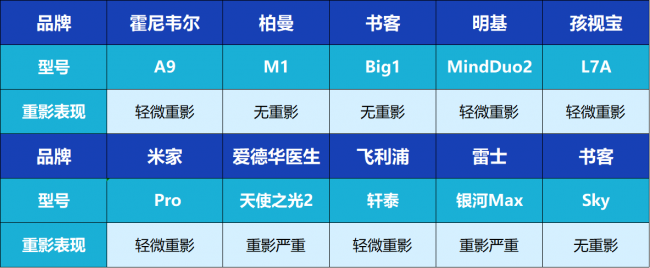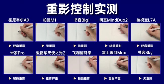 霍尼韦尔A9、明基MindDuo2、孩视宝L7A、米家Pro和飞利浦轩泰在实测中均出现了轻微重影现象。具体表现为:在笔尖快速移动或手部遮挡光线时,边缘会出现淡淡的虚边,但不至于影响正常书写。