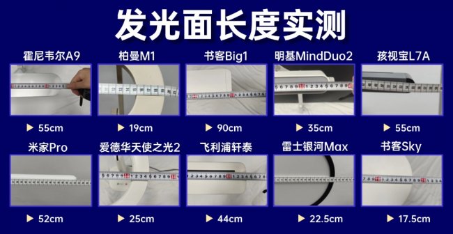 霍尼韦尔A9与孩视宝L7A的发光面长度均为55cm,米家Pro为52cm,飞利浦轩泰44cm,在标准1.2米书桌上,能够覆盖主要书写区域。实际使用中,中心区域亮度充足,两侧边缘会有一定衰减,但不至于形成明显暗区,适合单人学习、桌面使用范围相对集中的家庭。