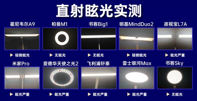 S级|眩光明显,直视与反射干扰较强:孩视宝L7A、米家Pro、爱德华医生天使之光2、飞利浦轩泰、雷士银河Max