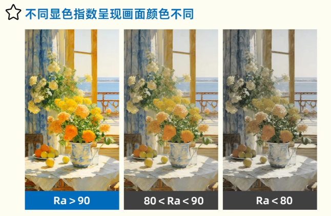 2.显色指数——色彩还原的真实度,影响视觉辨识与疲劳(1)什么是显色指数?显色指数(Ra)是衡量灯光还原物体真实色彩能力的指标,满分100,数值越接近100,色彩越逼真。