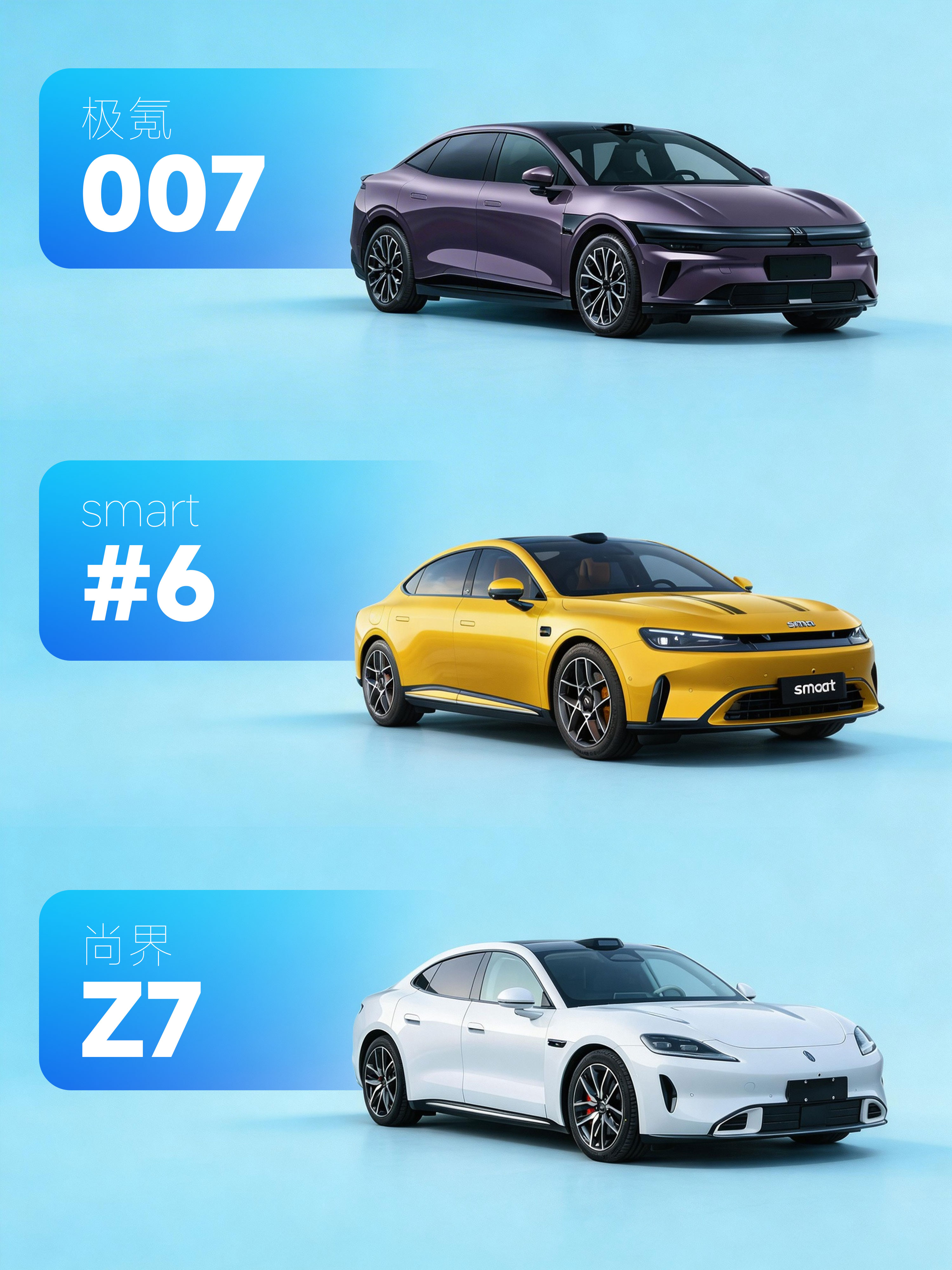 极氪007设计偏炫技,问界Z7风格偏常规,smart精灵6号更擅长运用攻击性美学,鲨鱼前脸与真风道组合气场充足,出场辨识