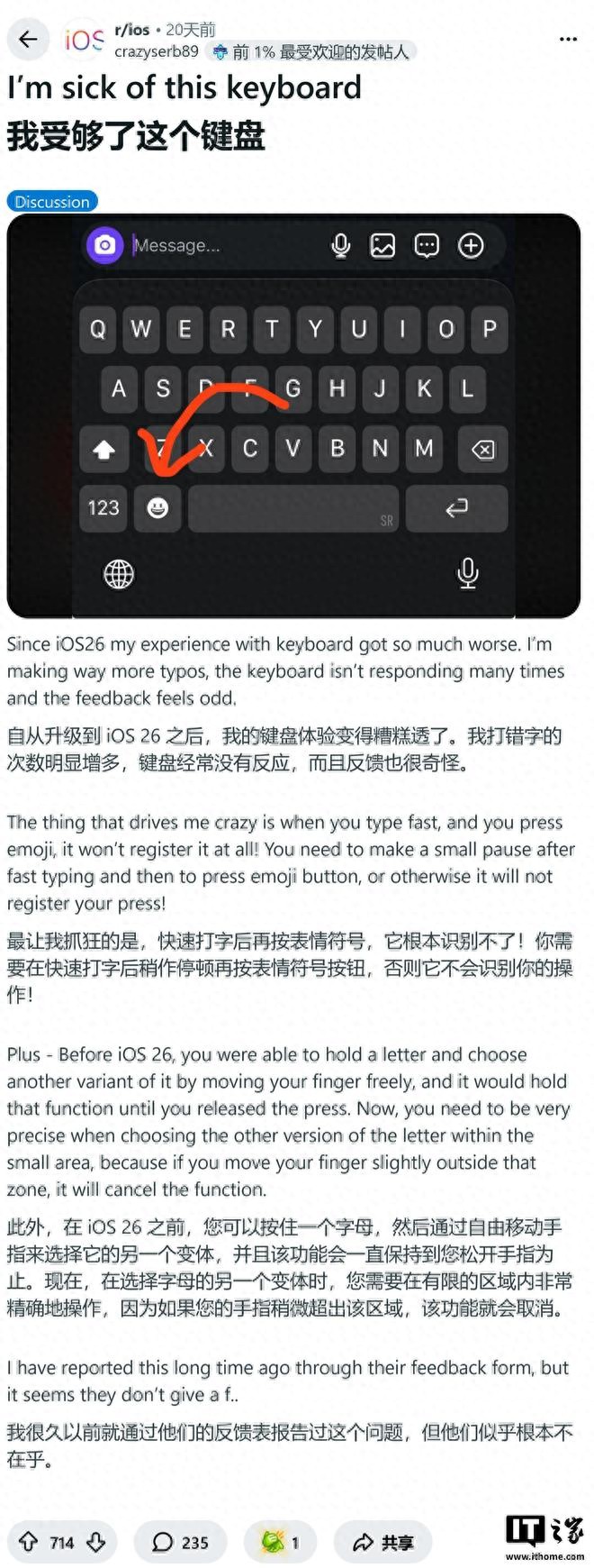 IT之家此前报道,部分 iPhone 17 等用户反馈,在升级 iOS 26 系统之后,在屏幕上快速打字时,系统输入经常会无故漏掉部分字符。