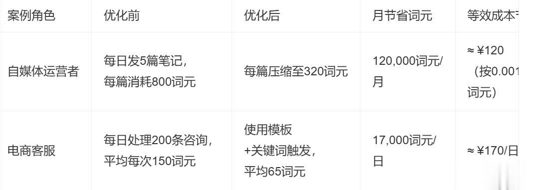 | 自媒体运营者 | 每日发5篇笔记,每篇消耗800词元 | 每篇压缩至320词元 | 120,000词元/月 | ≈ ¥120(按0.001元/词元) |