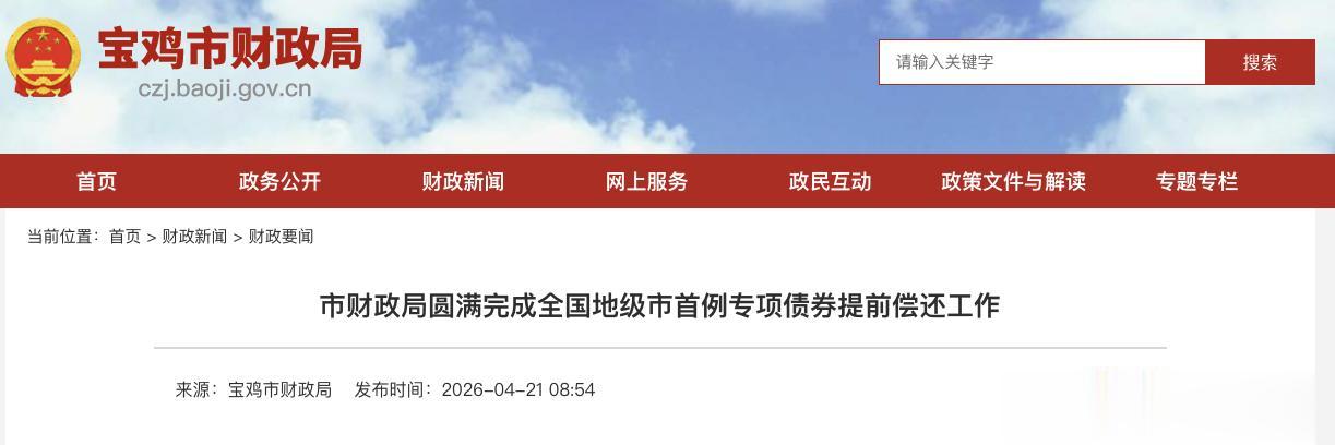 因为在此之前,这种提前还债的操作基本只在省级政府层面出现过,而宝鸡市这次操作,标志着他们成为了全国首个成功开展专项债券提前偿还业务的地级市。