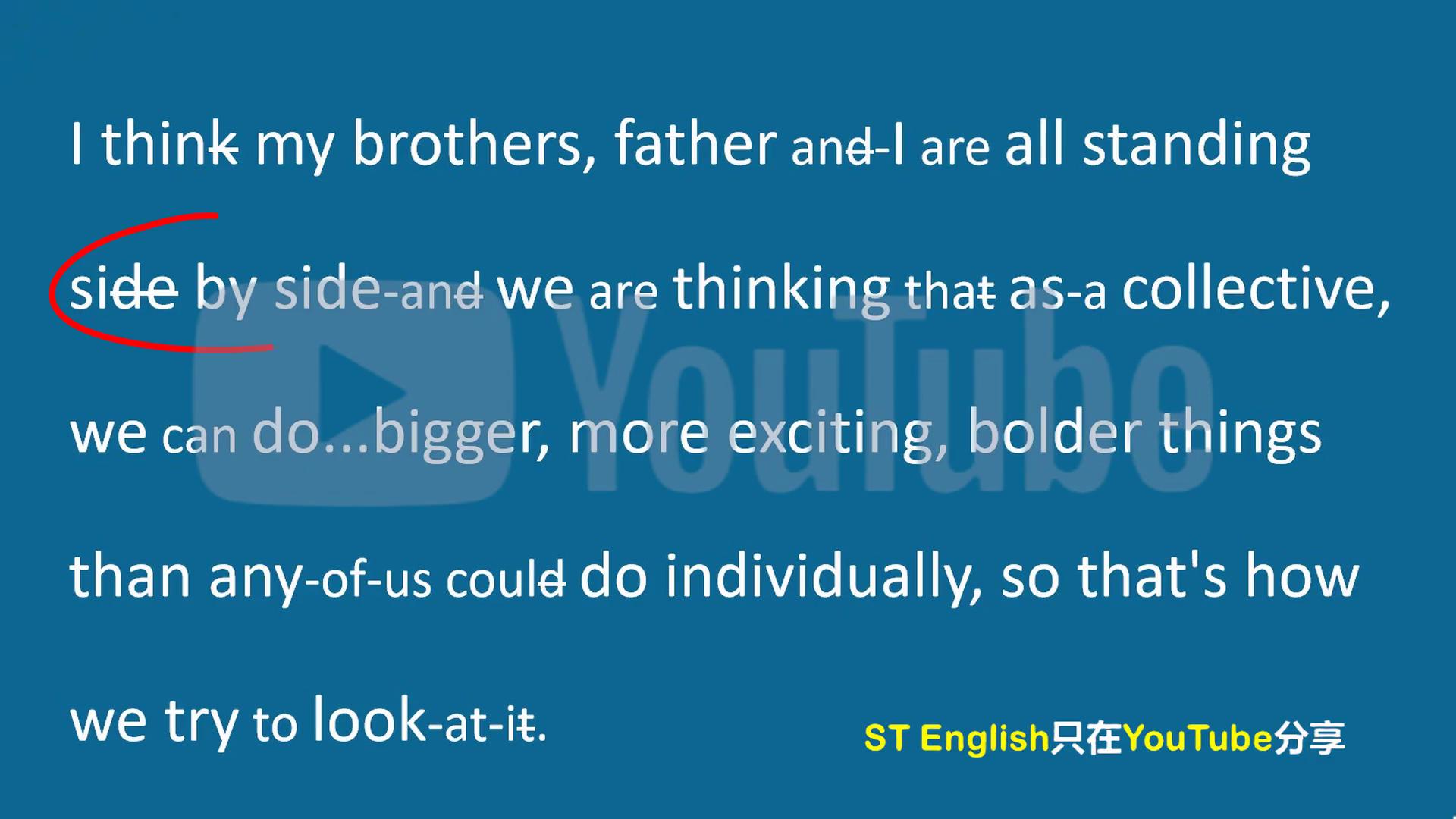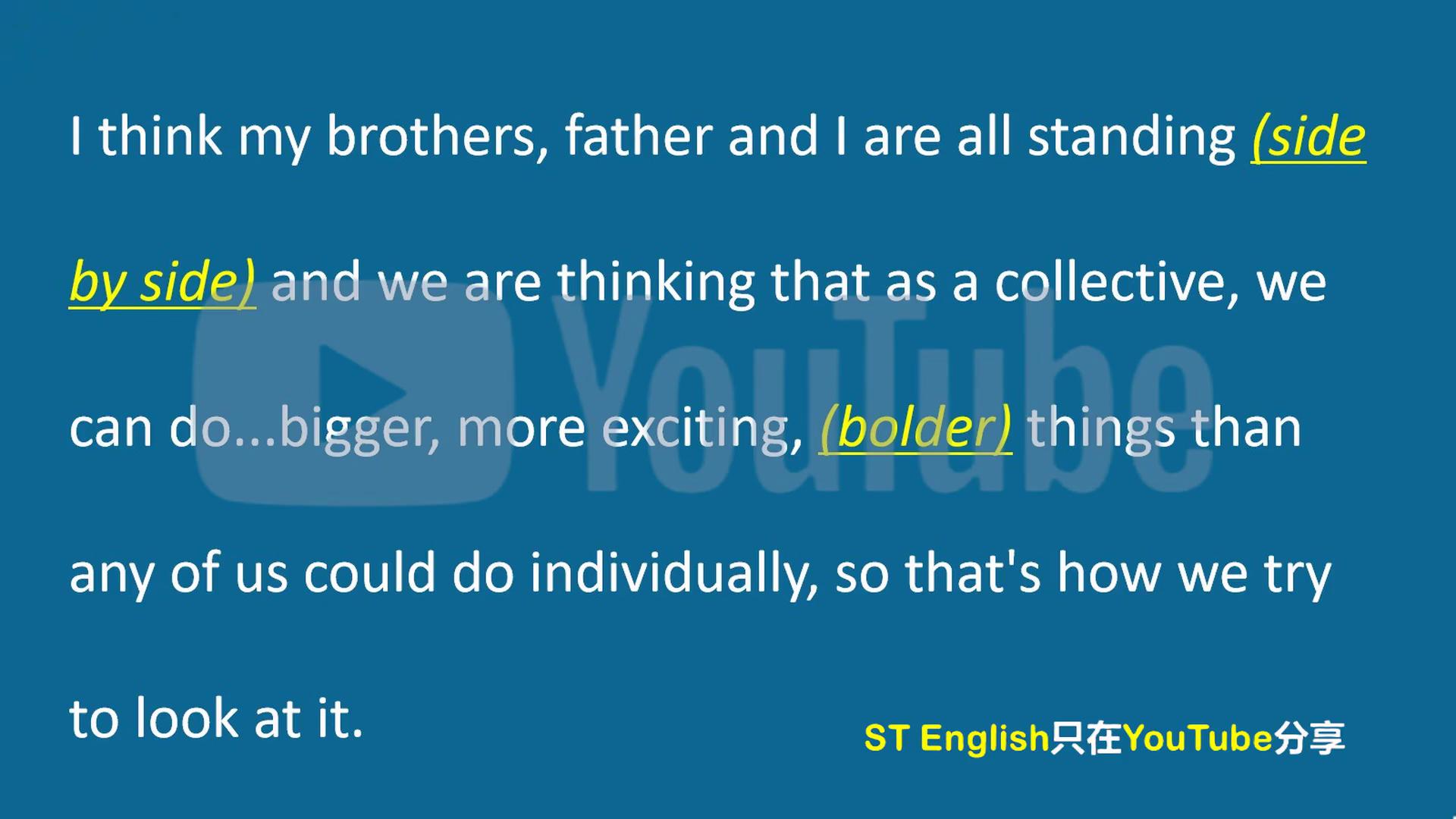 下面我来按照元素跟读一遍,大家看一看下绕线的部分能不能听出来是什么单词。i think my brothers,father and i are all standing side by side and we are thinking that as a collective,we can do.bigger more exciting, (bolder) things than ST English只在YouTube分享。