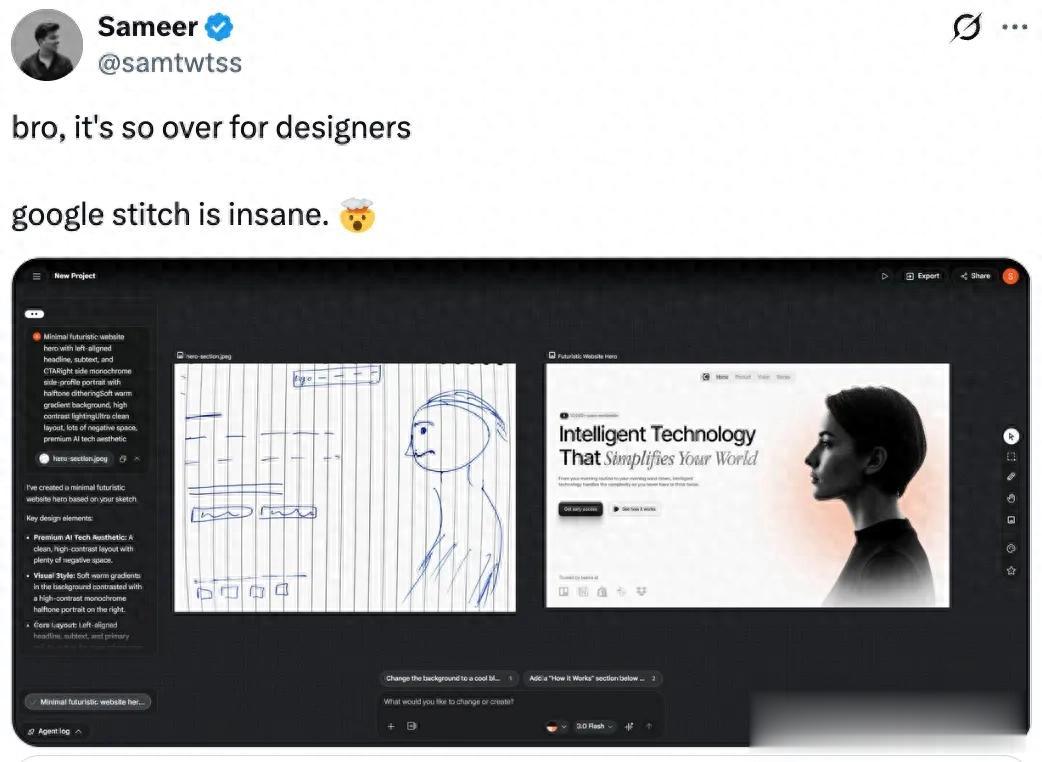 Stitch和Figma的核心功能高度重叠——都是 UI/UX设计工具,都面向网站和App设计场景。但谷歌有三张Figma没有的牌: