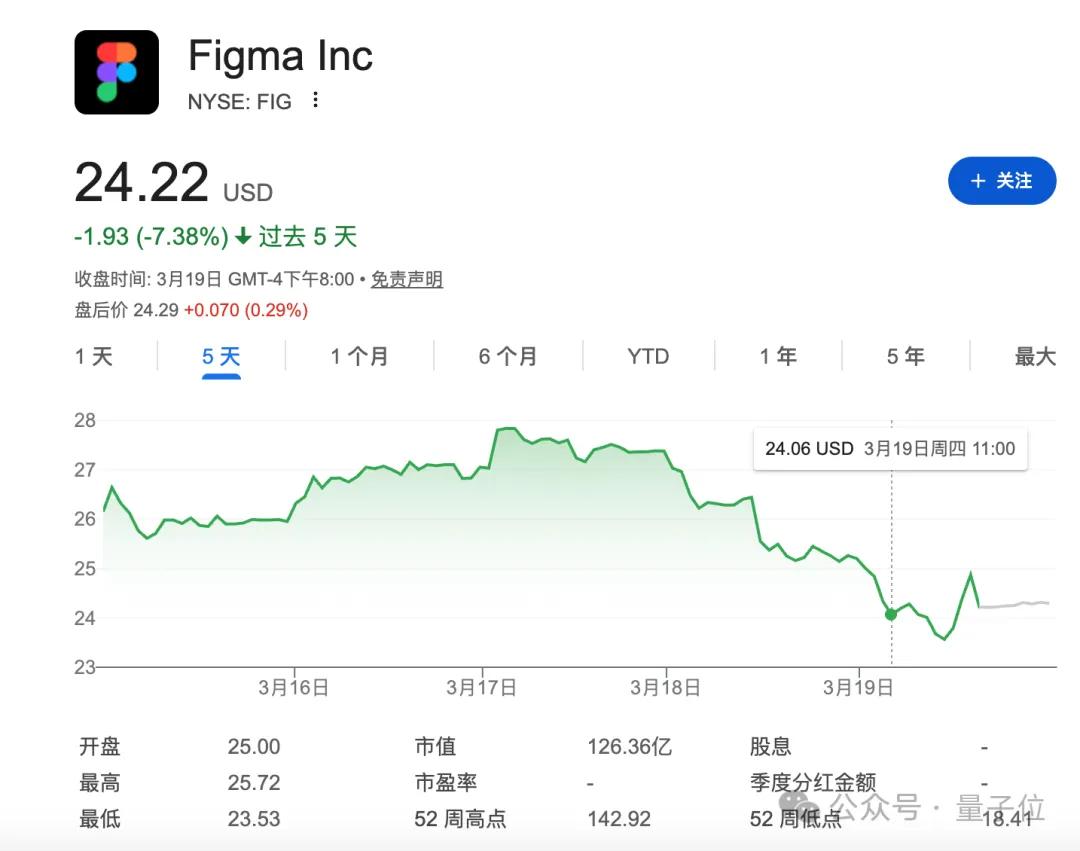 你看,产品是周三发的,当天Figma股价直接暴跌8%,周四仍下跌约5%,两天内跌幅约13%。