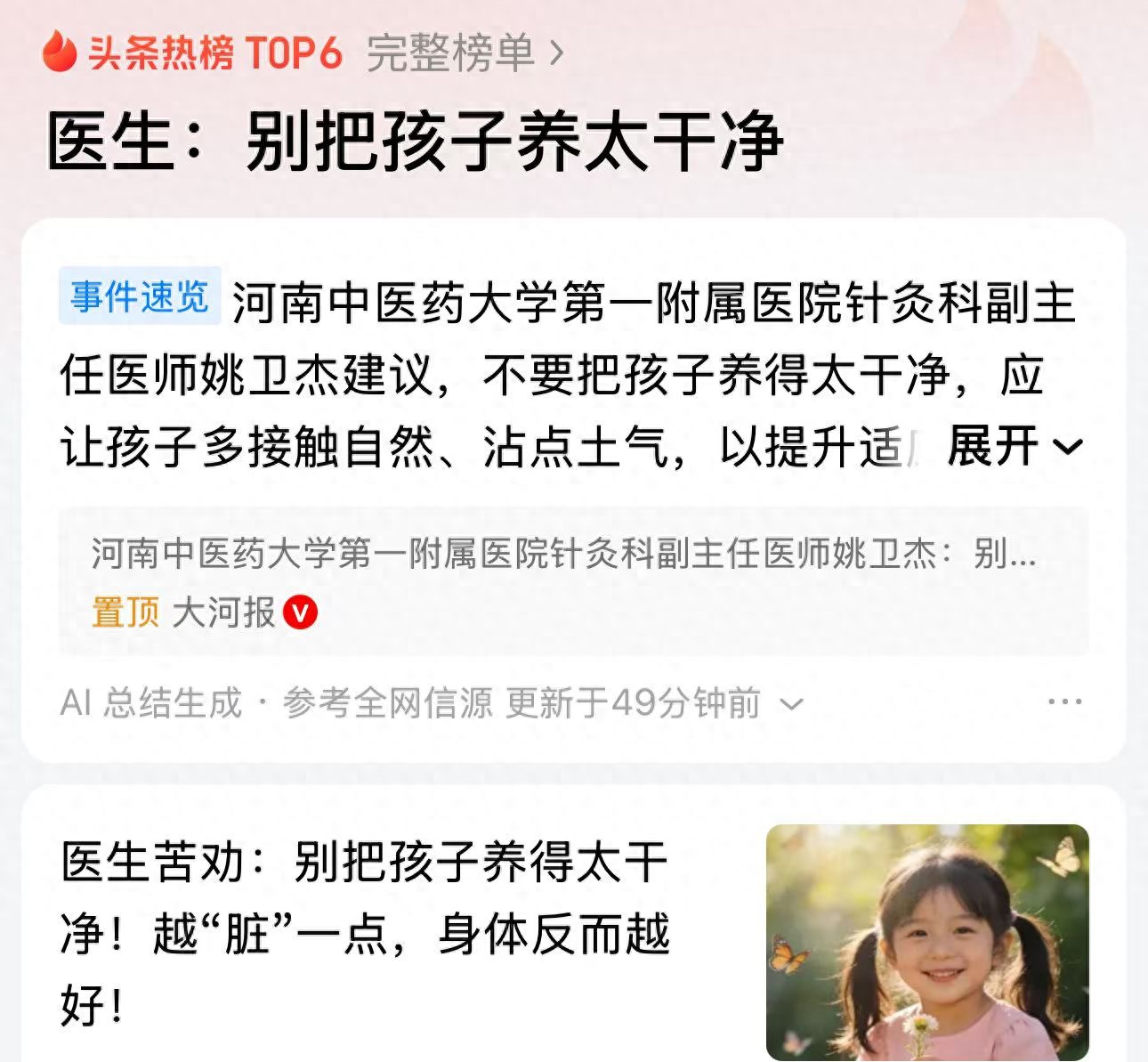让孩子回归自然,才是最好的养育姚卫杰医生的建议并非空穴来风。医学研究表明,儿童免疫系统的建立需要在生命早期接触多种微生物。**过于干净的环境反而会增加过敏、哮喘等免疫系统疾病的风险。**