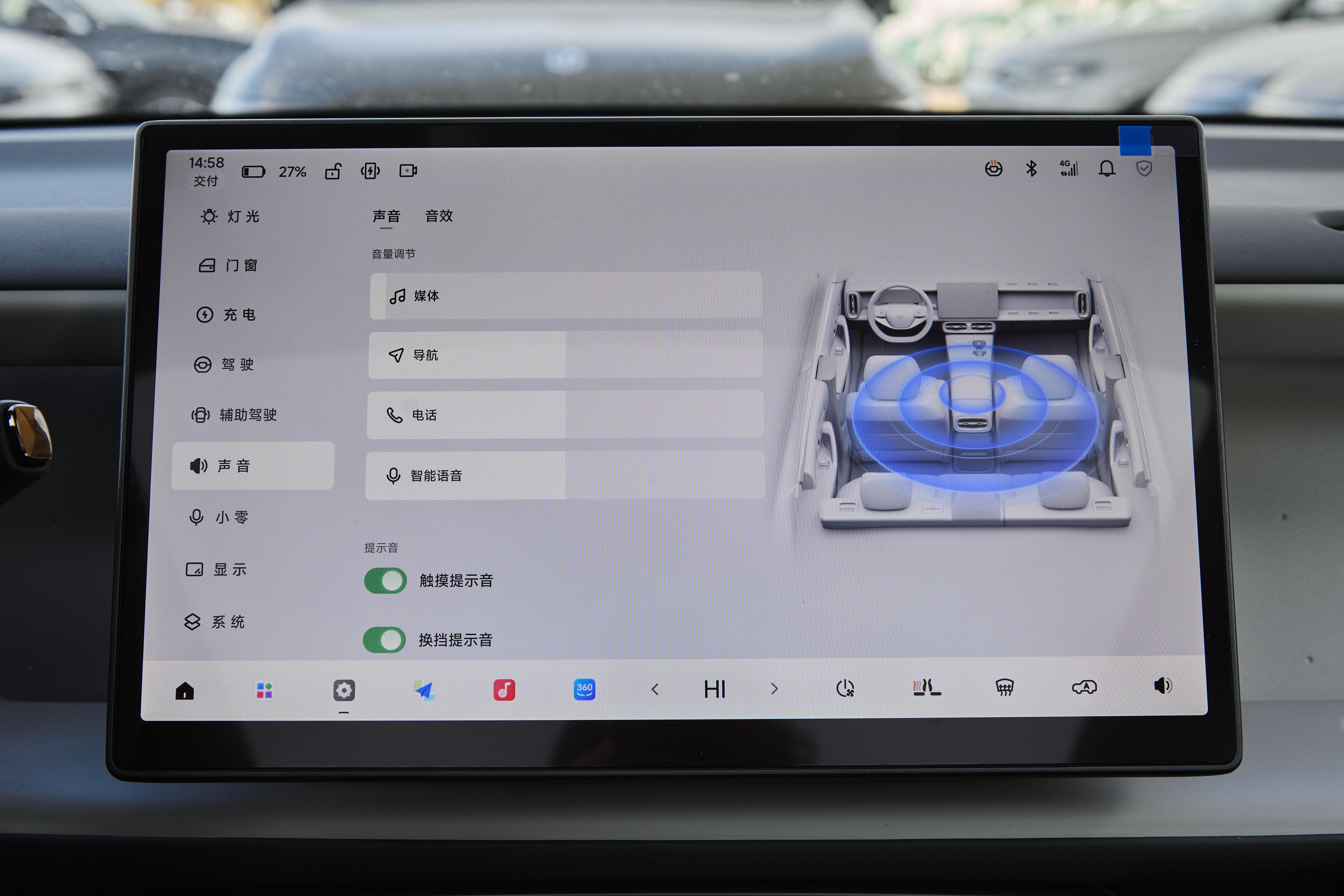音响系统配备12个扬声器,支持7.1声道环绕声。低音部分的瞬态响应得到了优化,人声的清晰度也有所提升。配合车内256色氛围灯,灯光可以随着音乐节奏变化,夜晚开车时能营造出不错的车内氛围。此外,车辆还支持无需手持麦克风的卡拉OK功能,通过车顶的收音阵列捕捉声音,朋友聚会时在车里唱歌娱乐也比较方便。