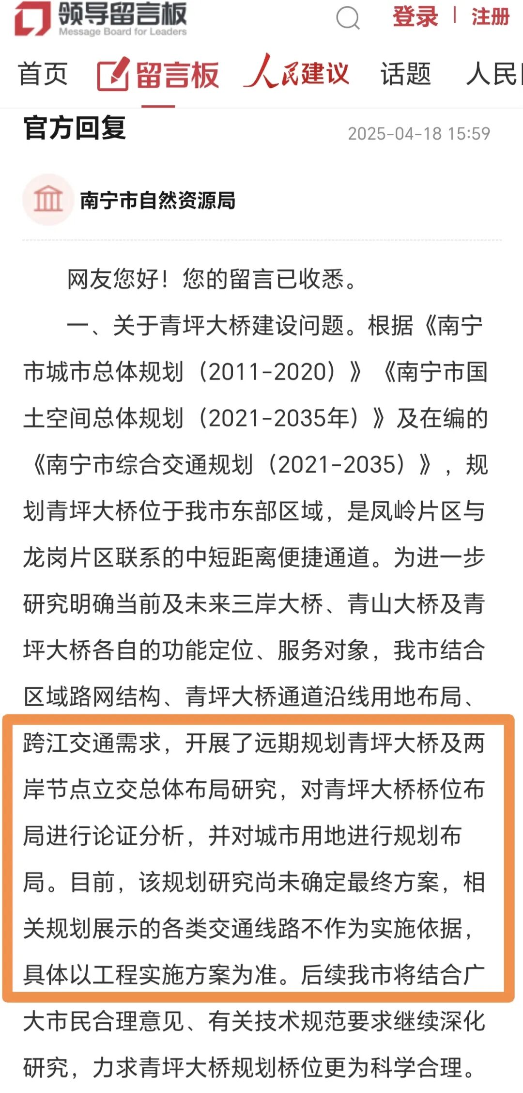 南宁自然资源局回复中,也表明青坪大桥的重要地位,是联系中心城埌东片区、凤岭片区与龙岗片区的重要交通通道。