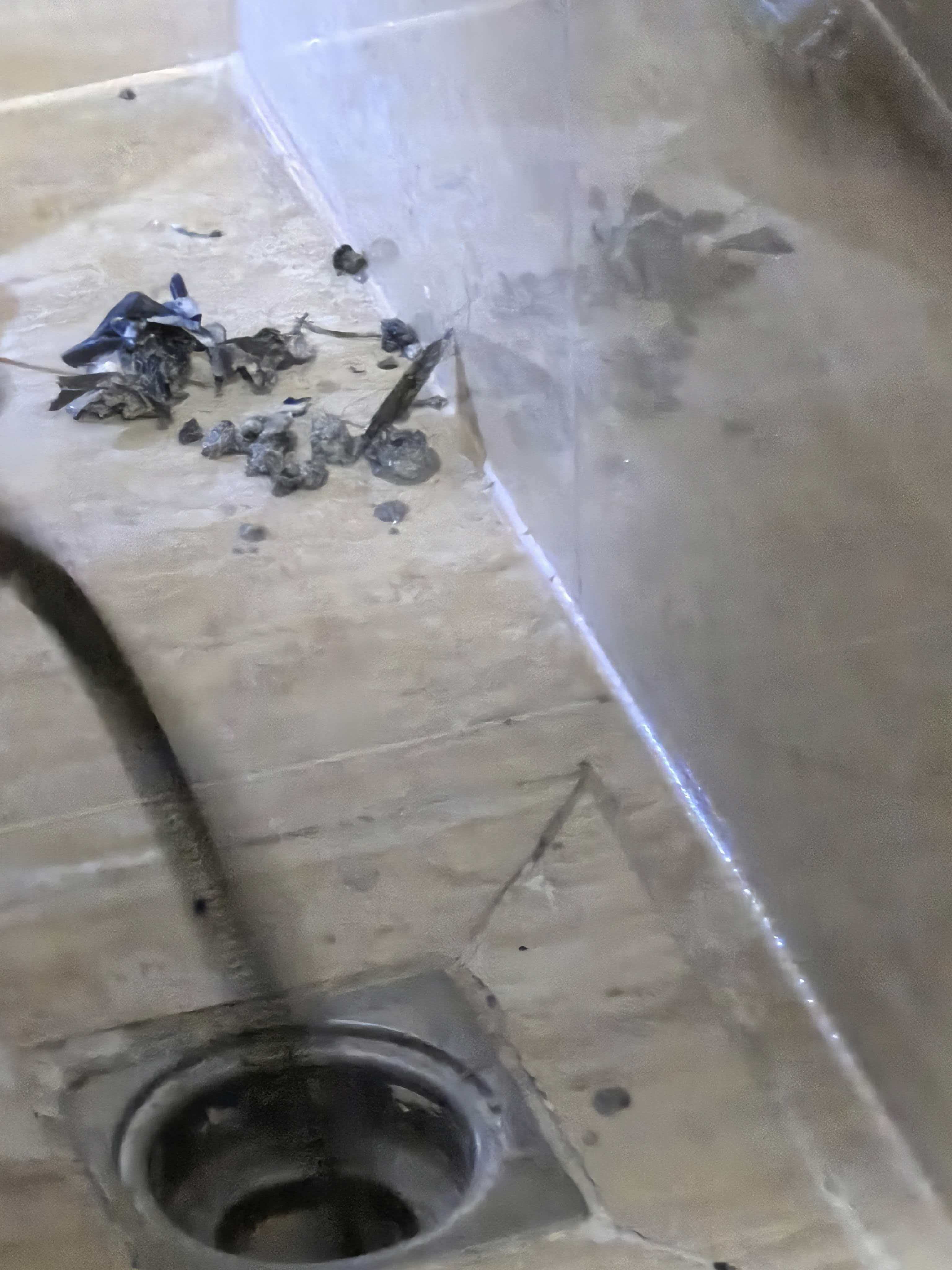 师傅用专用吸附器,伸进管道,将杂物小心翼翼,一块一块吸出来,两个卫生间的地漏都各吸出一小堆。