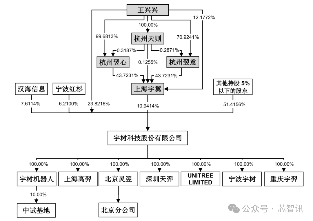 截至本招股说明书签署日,宇树科技董事长、总经理、首席技术官王兴兴直接持有公司 8,671.4964 万股股份,占宇树科技股本总额的 23.8216%,通过上海宇翼控制宇树科技 10.9414%的股份,合计控制宇树科技 34.7630%的股份。结合特别表决权的设置安排,本次发行前,王兴兴合计控制表决权比例为 68.7816%,能够对宇树科技股东会的绝大多数决议产生重大影响,为宇树科技控股股东、实际控制人。本次发行后,王兴兴合计控制的表决权比例将降至不超过 65.3090%。