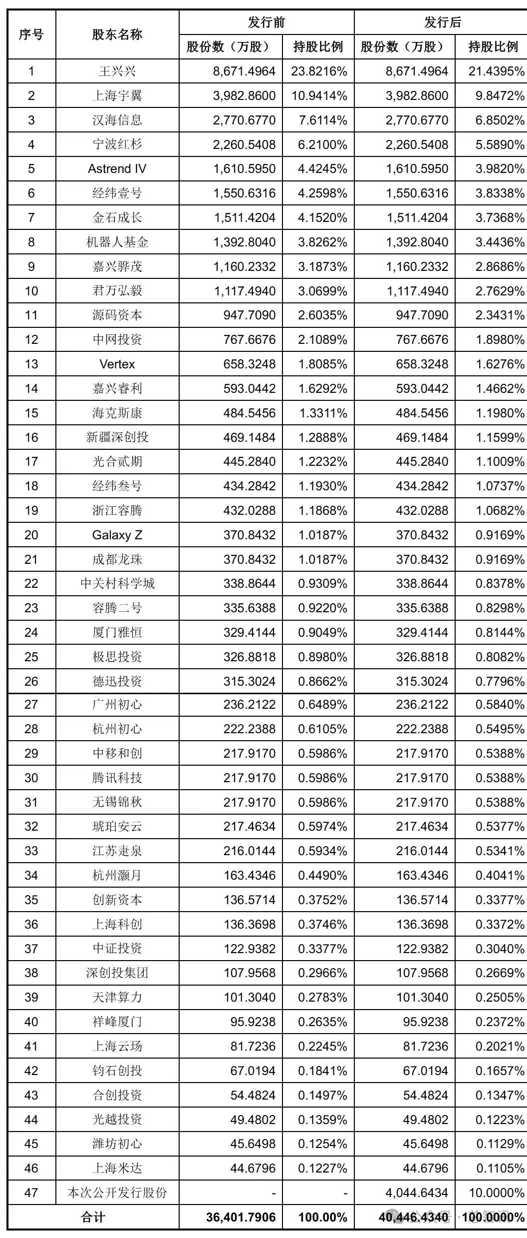 红杉中国为宇树科技的第三大股东,其通过宁波红杉与厦门雅恒为一致行动人,合计持有宇树科技股权比例为 7.1149%;经纬创投为宇树科技的第四大股东,其通过经纬壹号与经纬叁号为一致行动人,合计持有宇树科技股权比例为 5.4528%。此外,Astrend IV为雷军旗下顺为资本关联公司,持股宇树科技4.4245%、腾讯科技持股0.5986%。