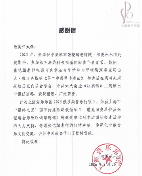 闽江学院,正是这样一所将国际交流融入办学血脉的高校,而一封来自上海爱乐乐团的感谢信,向我们娓娓道来这所学校的实力与温度。